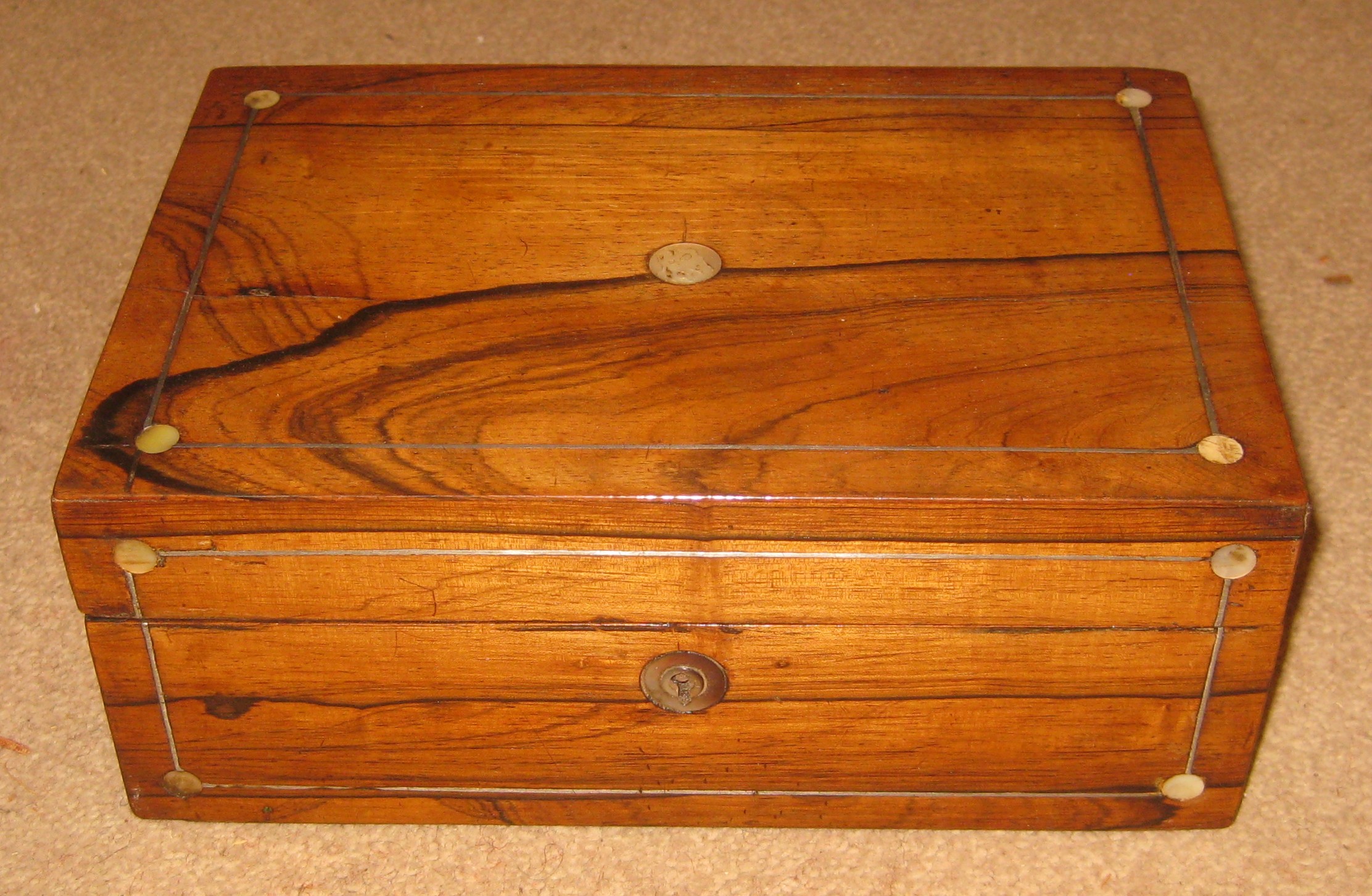 Beautiful Victorian rosewood box. With ‘silver’ inlay and working lock with key.