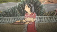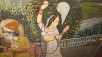 20th Century Radha Krishna gouache and watercolour painting on fabric. In oak frame.