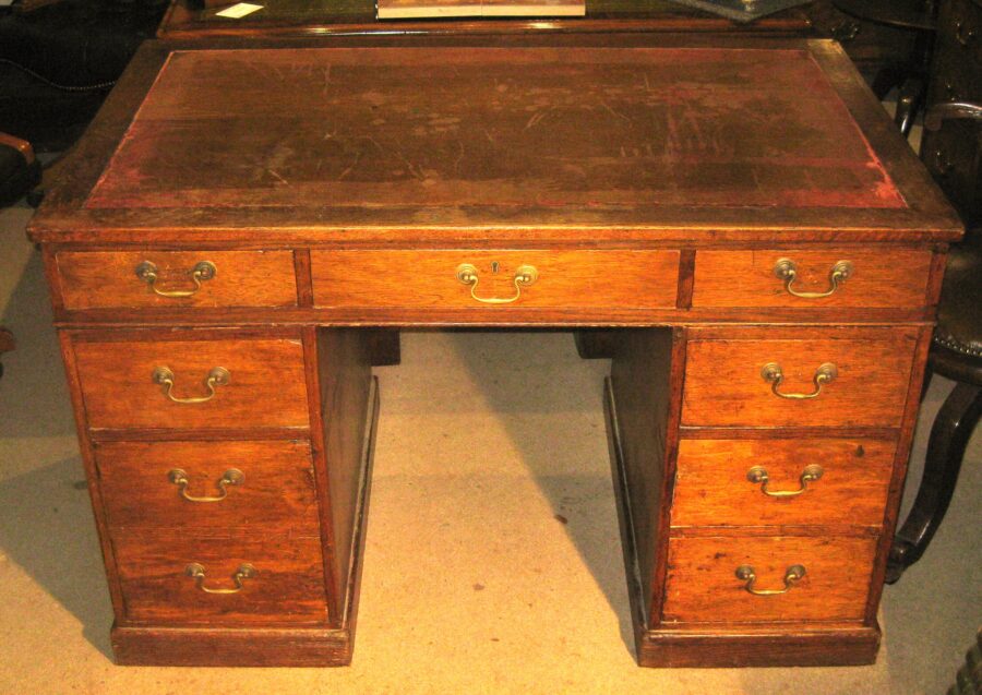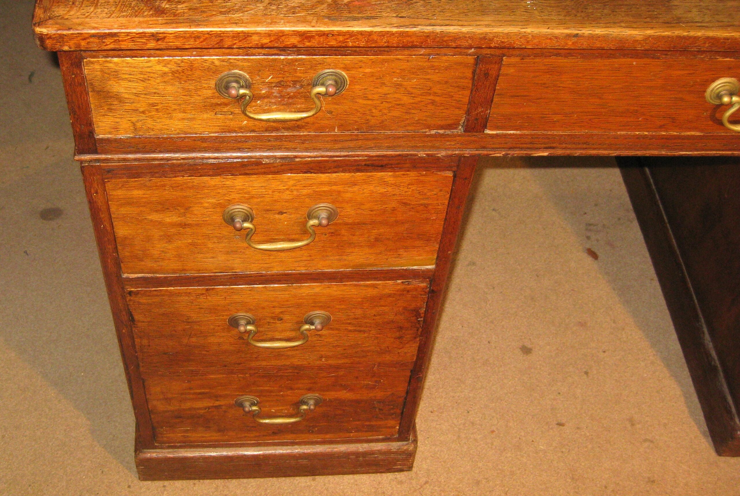 Oak and mahogany pedestal desk with good solid brass swan-neck handles.