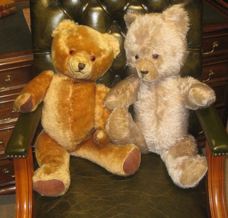 Adorable 1950’s limb jointed teddy bear in golden brown mohair type fur, glass eyes, stitched nose and mouth and internal growler. Also a matching one with paler fur and without growler (or not working)