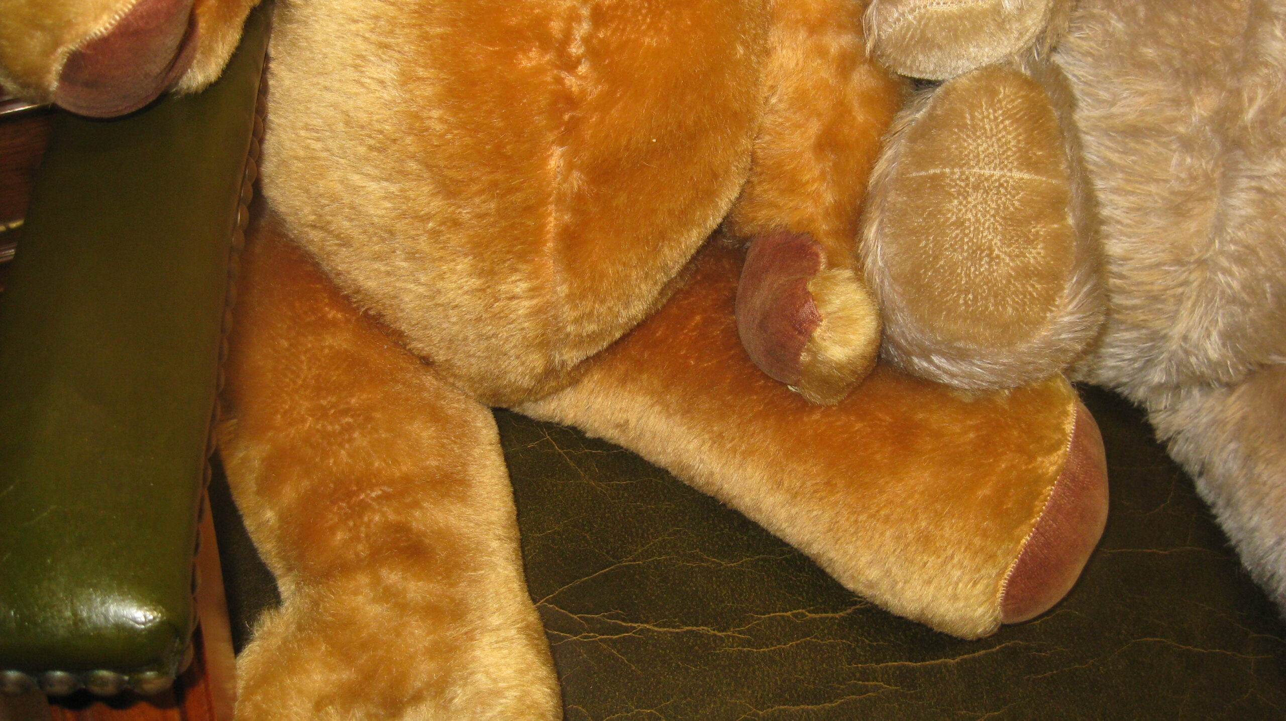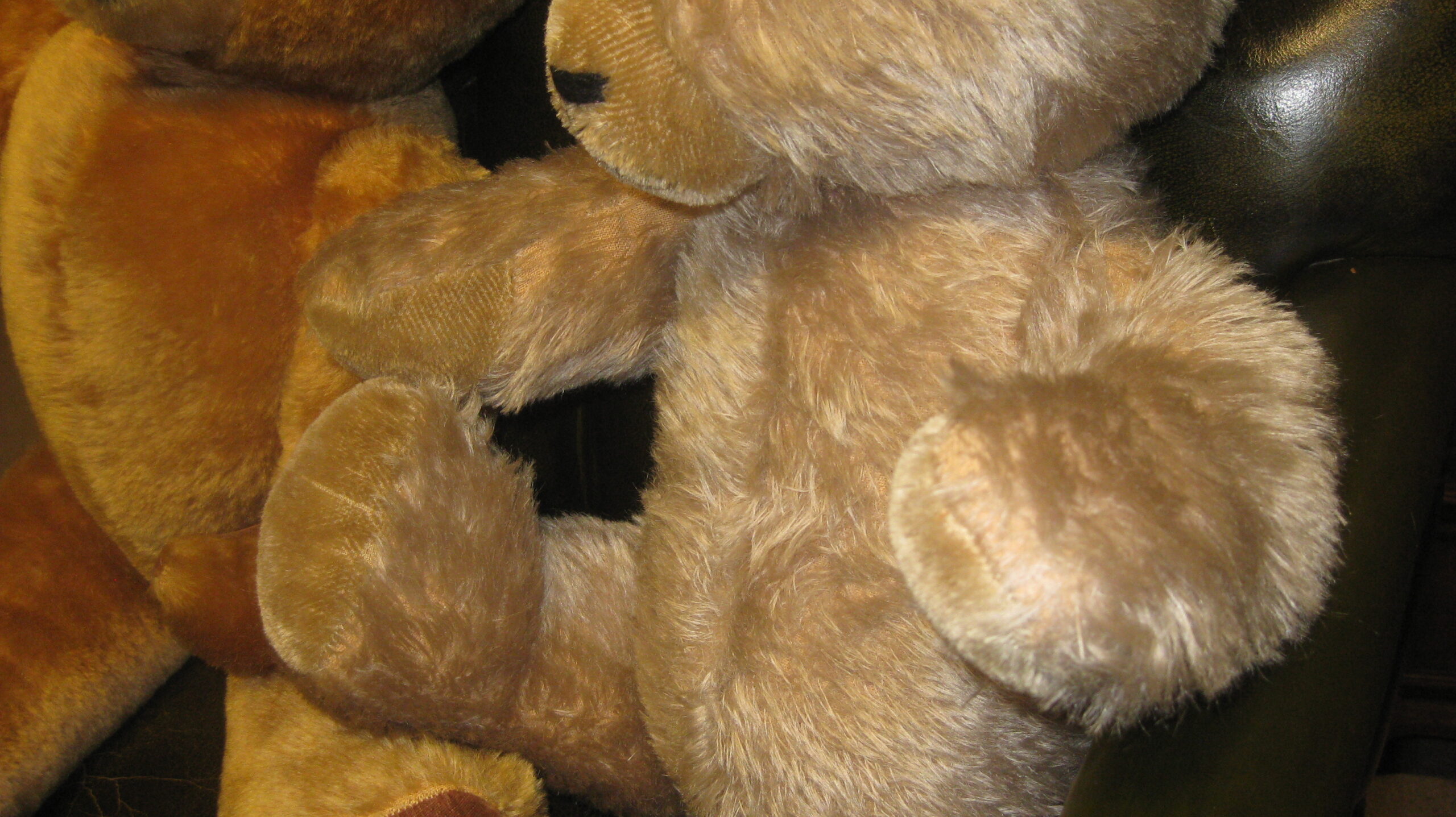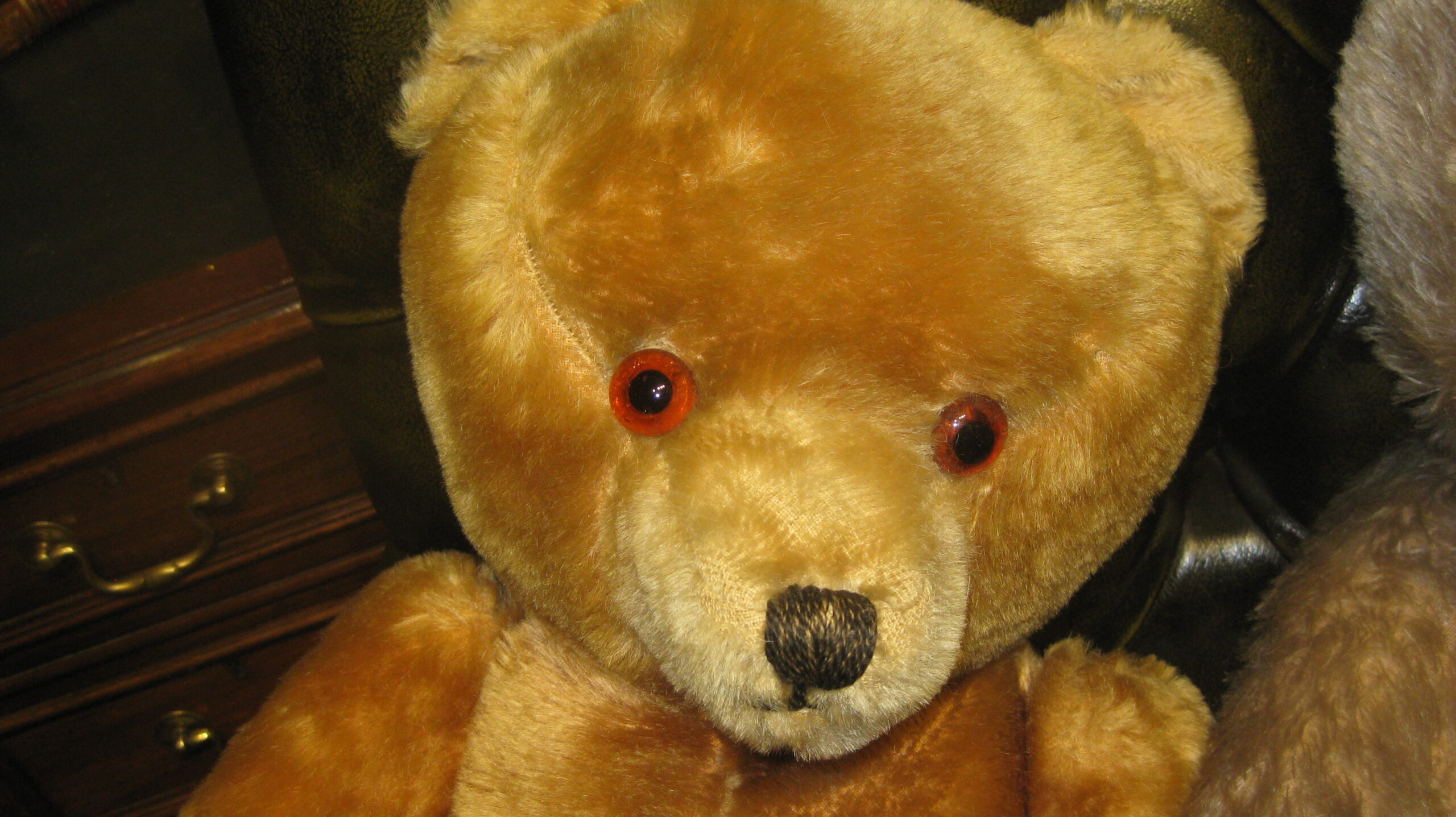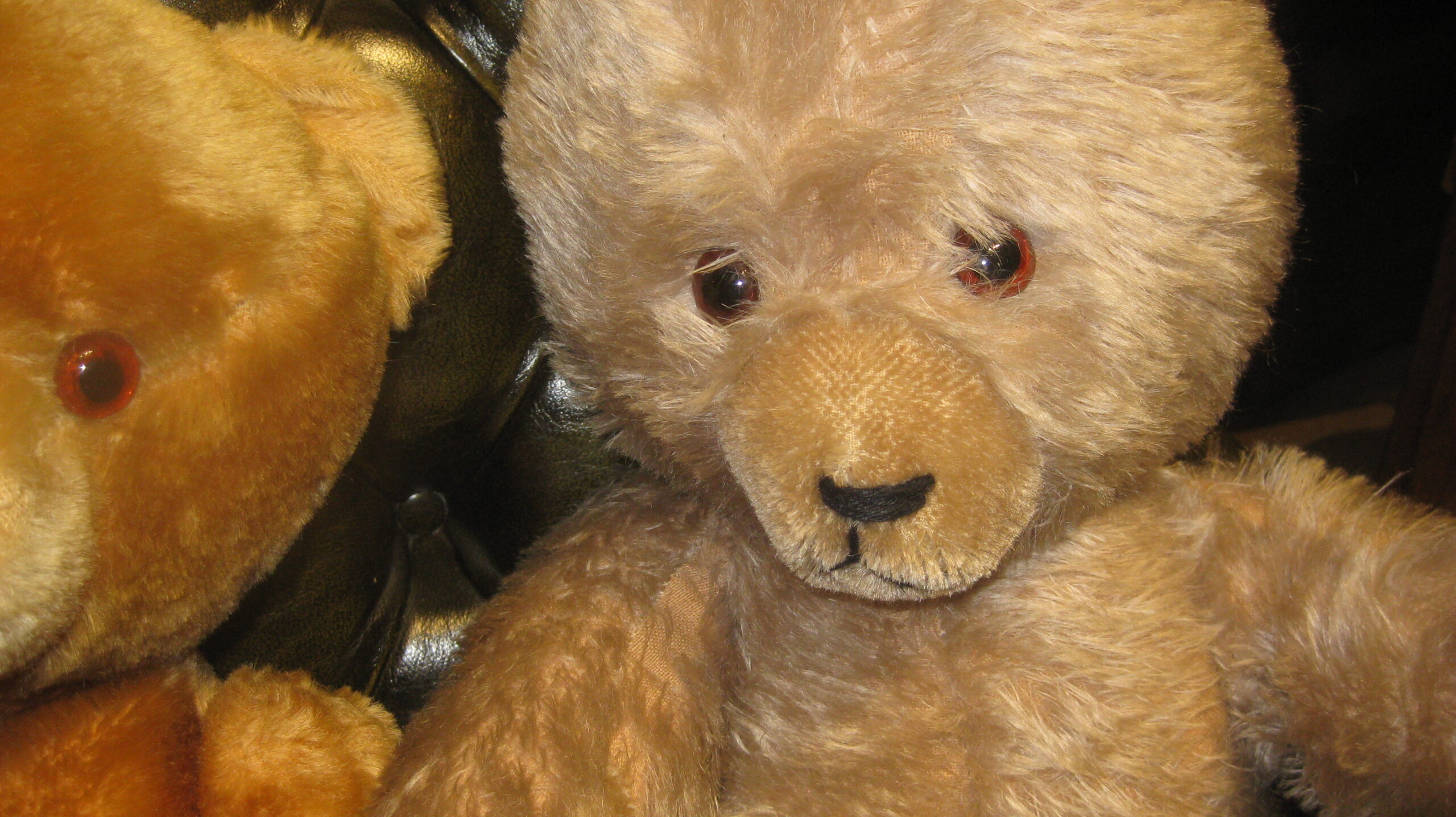 Adorable 1950’s limb jointed teddy bear in golden brown mohair type fur, glass eyes, stitched nose and mouth and internal growler. Also a matching one with paler fur and without growler (or not working)