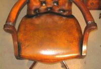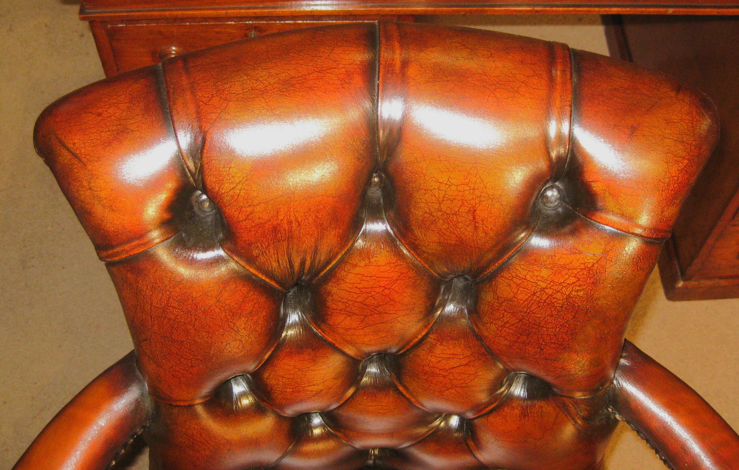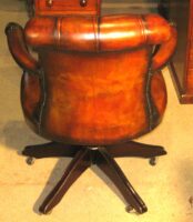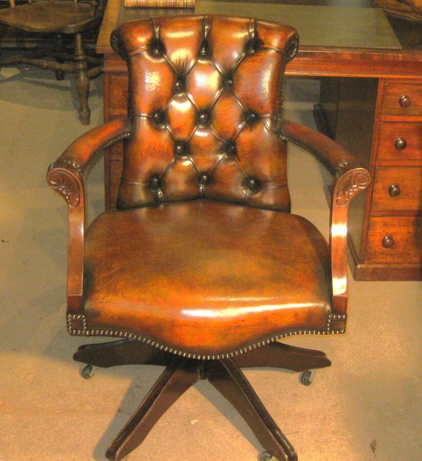 Beautiful reproduction mahogany framed Admiral’s desk chair in golden tan buttoned leather. The buttoned back with padded arms and mahogany front above a plush leather seat. On fully adjustable, revolving and tilting base.