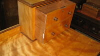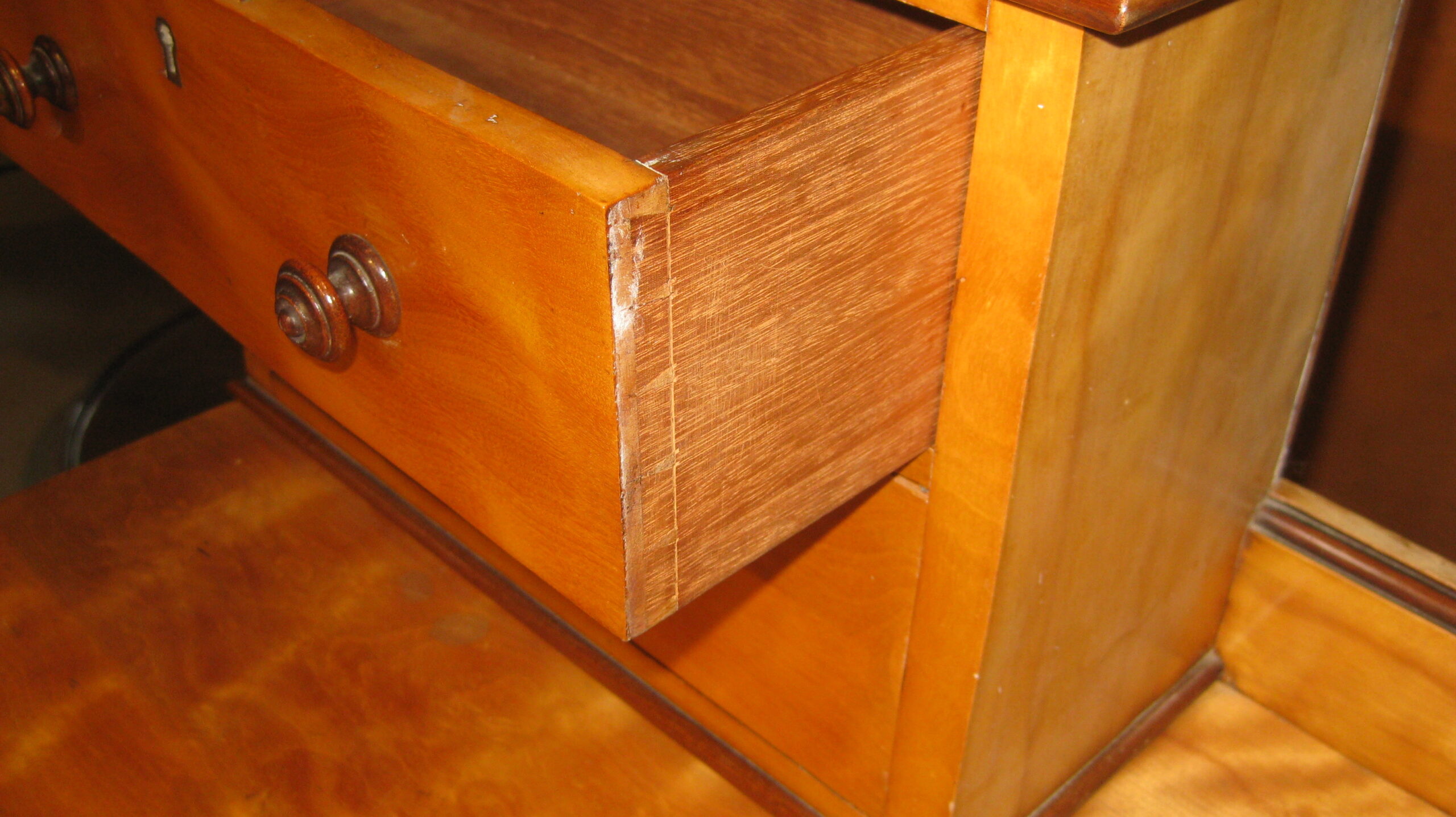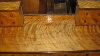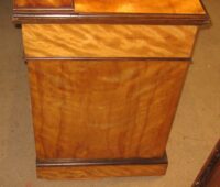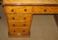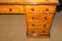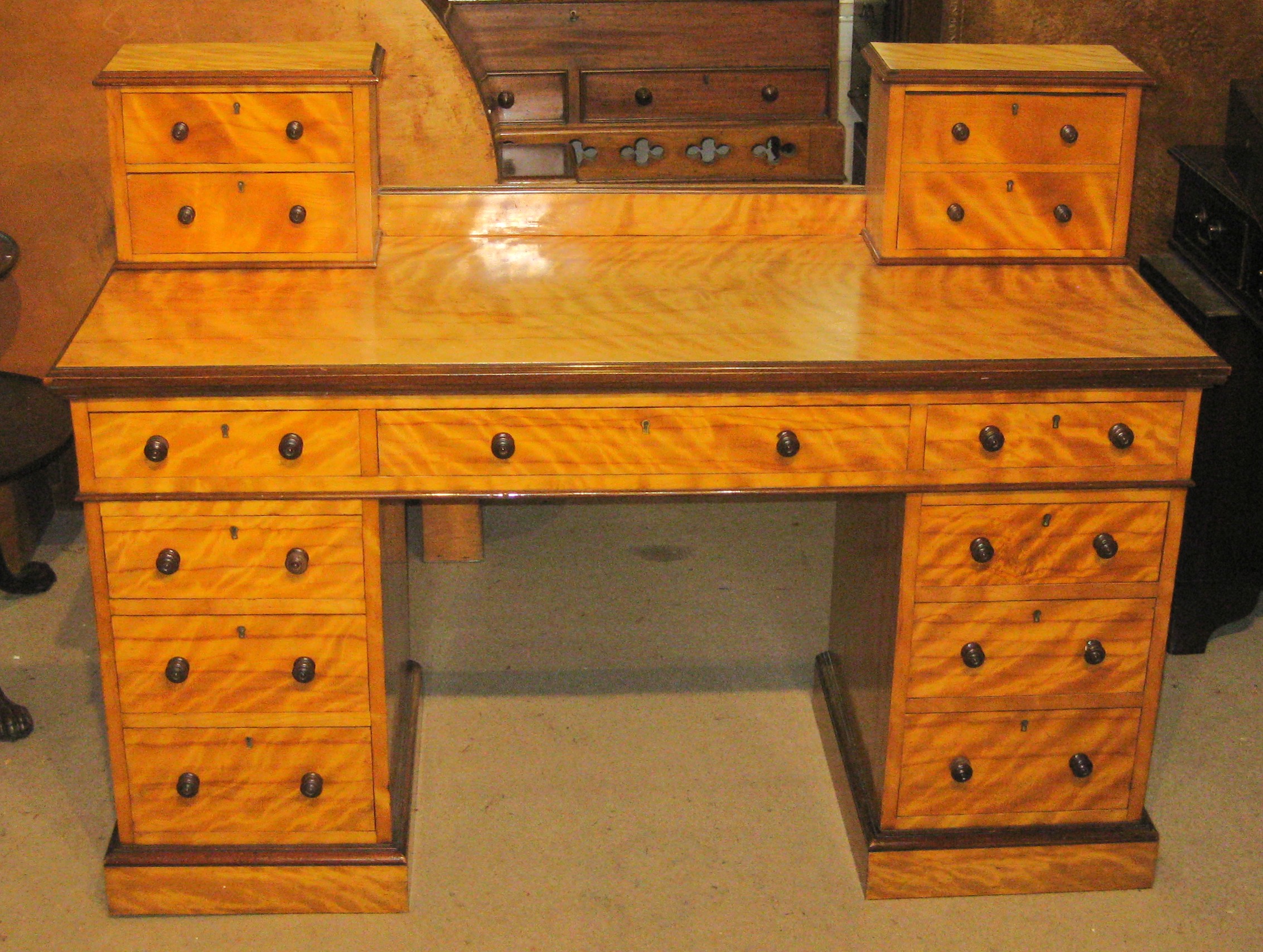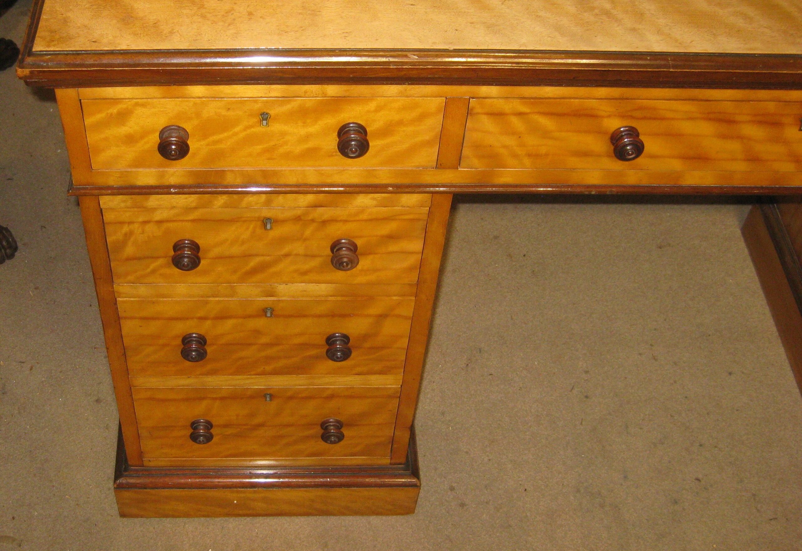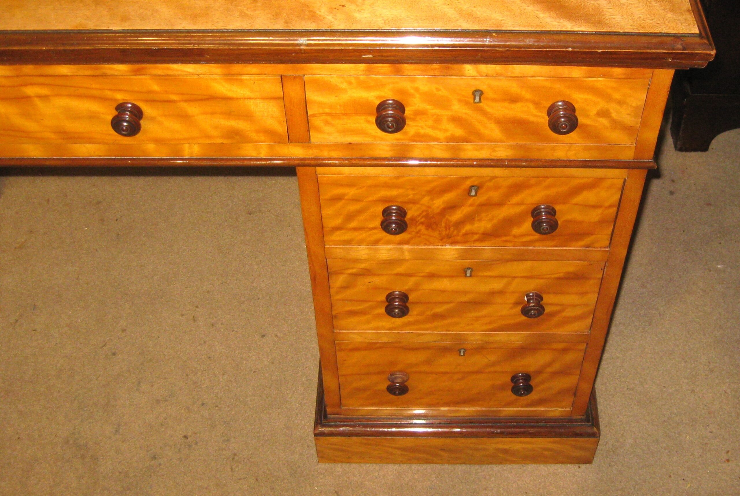 Beautiful Victorian satinwood desk. The nine drawers of a lovely quality, hand-cut, dovetailed construction with mahogany linings, original turned knob handles and working locks. The top section, with 2 small and one double depth drawer, can be removed to make a classic pedestal desk.