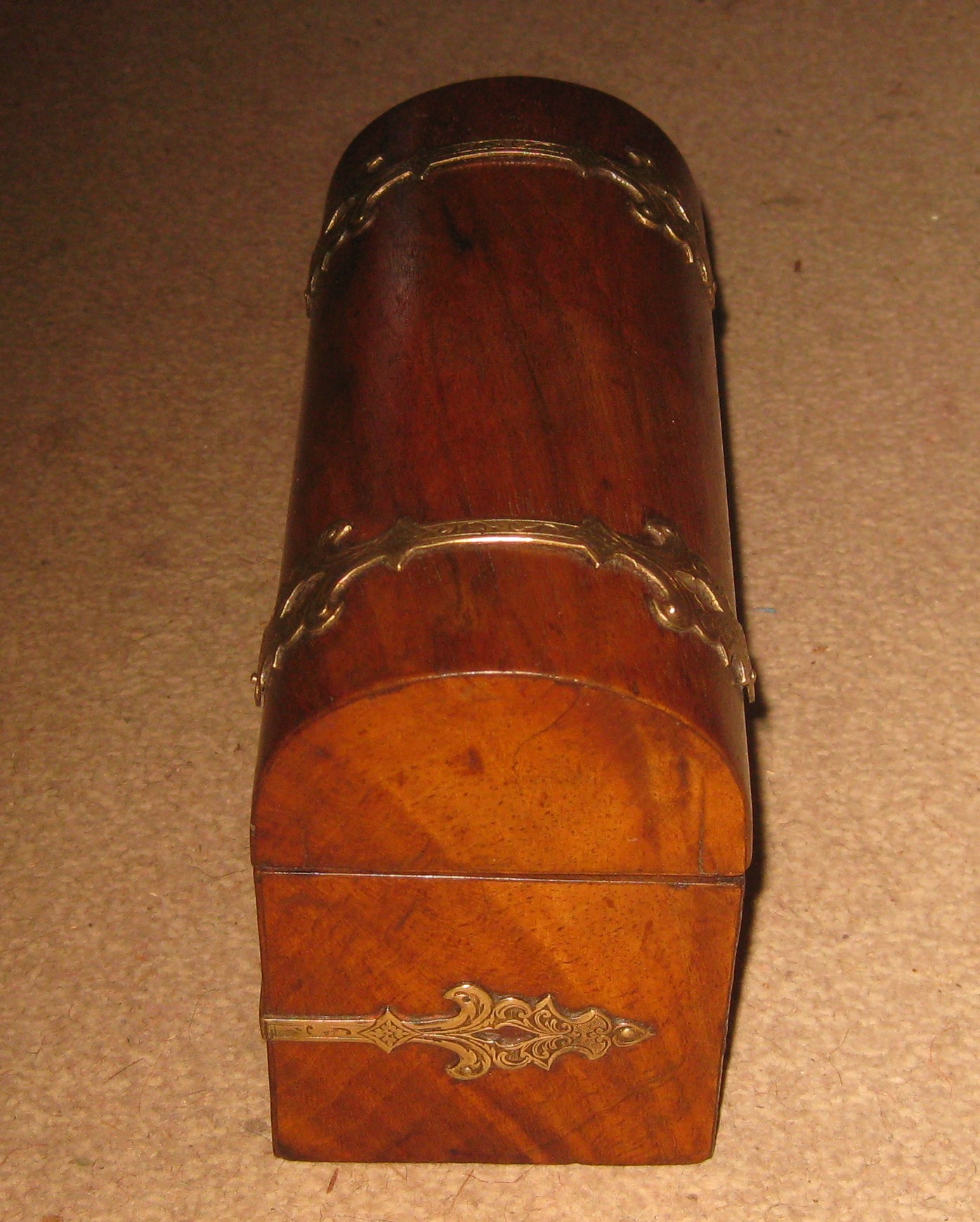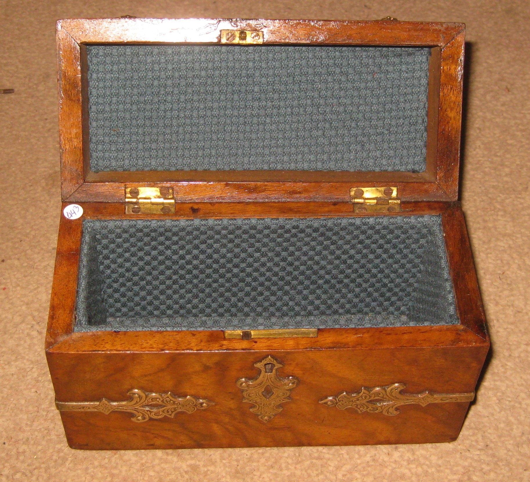 Beautiful little Victorian walnut dome topped box. The locking top opening to reveal a newly lined interior. Decorated all over with engraved brass decoration. With working lock and key.