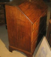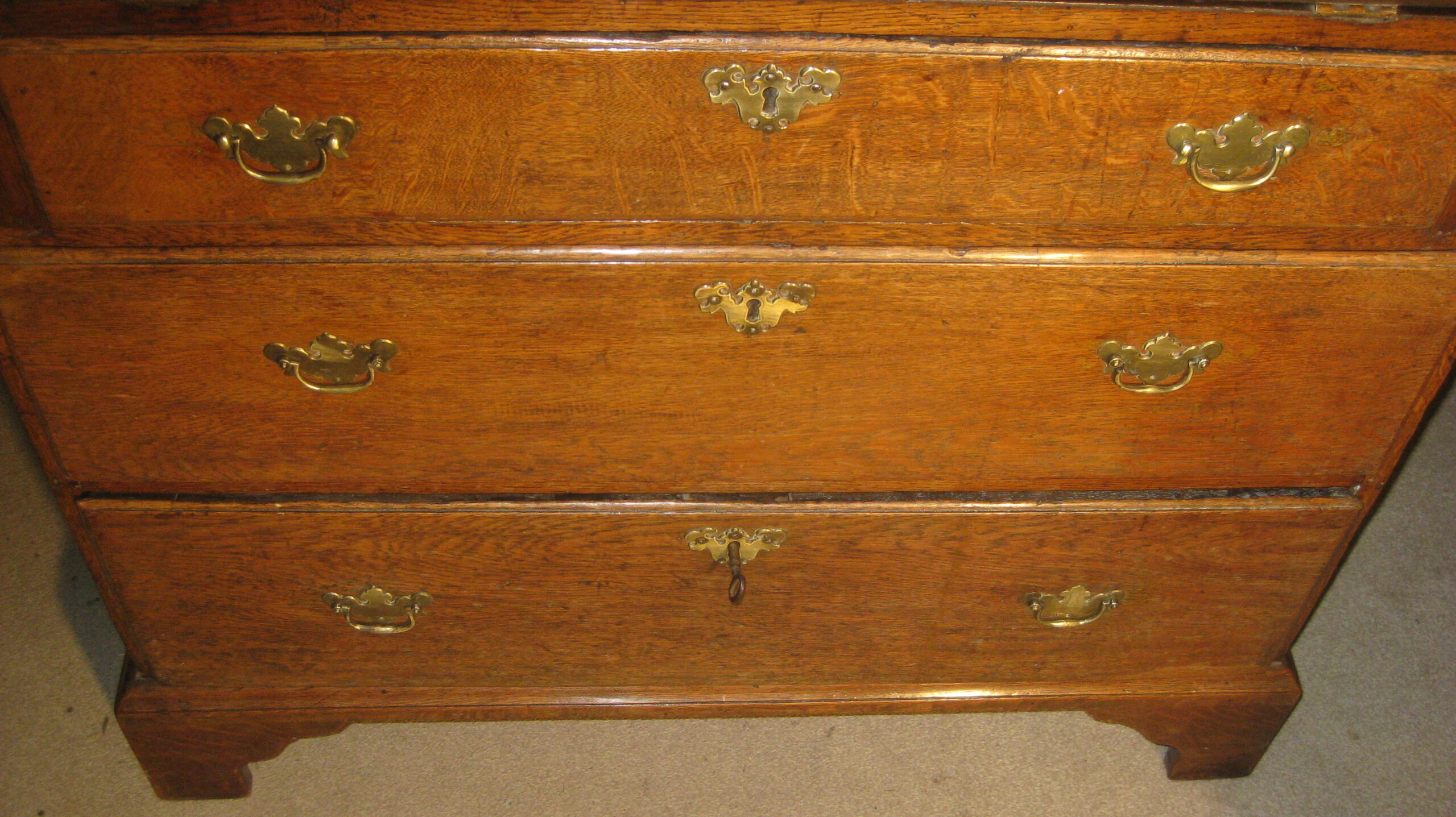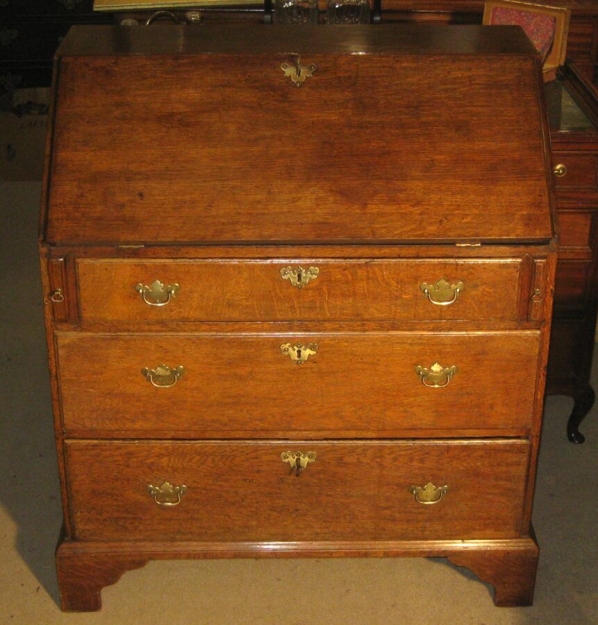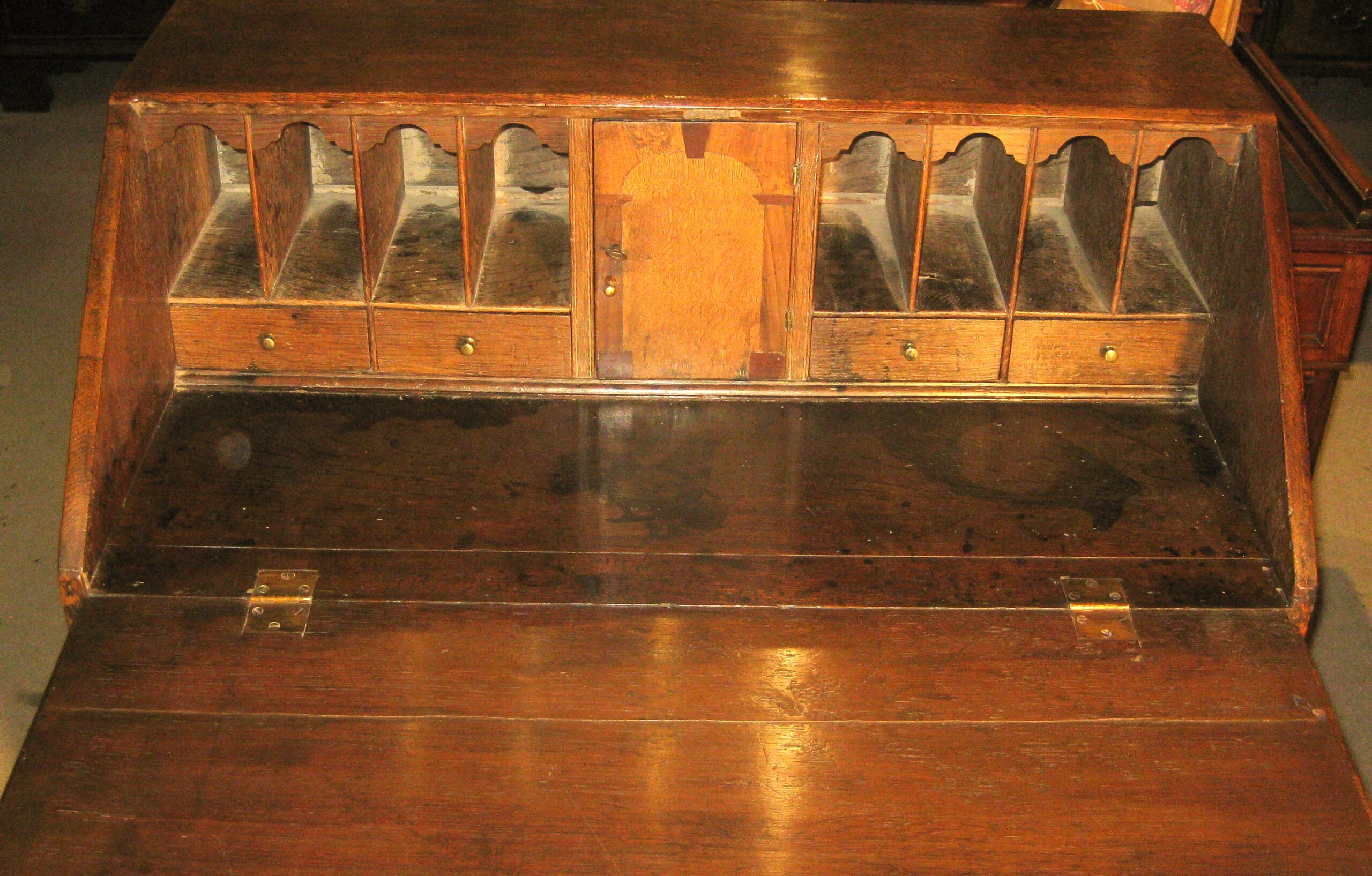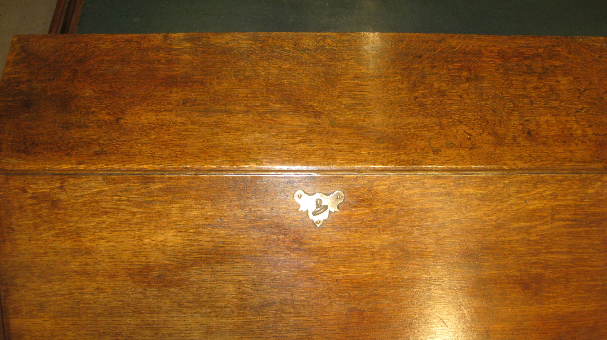 Early Georgian solid oak bureau. The locking fall opening to reveal a pretty interior with pigeon holes, small drawers and lockable central door. Below are 3 large drawers of a good, hand cut, dovetailed construction with brass plate handles. Standing on bracket feet.