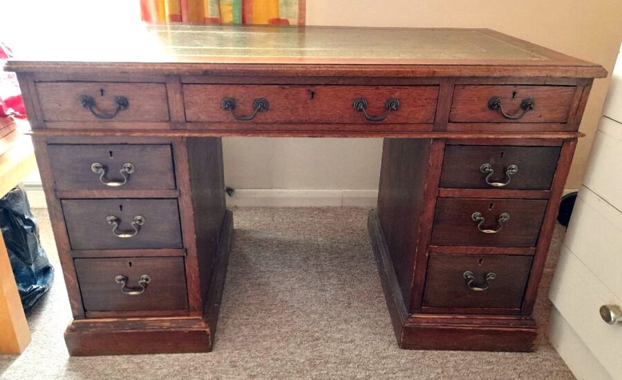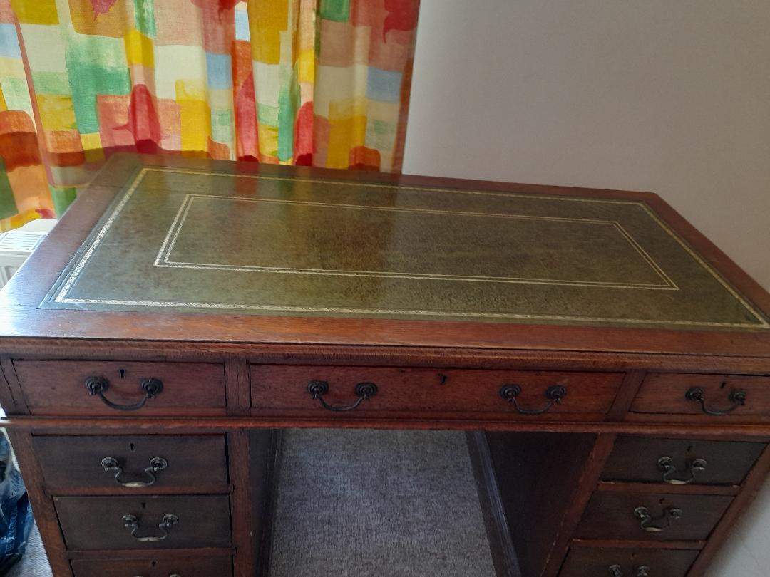 Edwardian solid oak pedestal desk. The nine drawers with brass handles and the top with a green leather in good condition,
