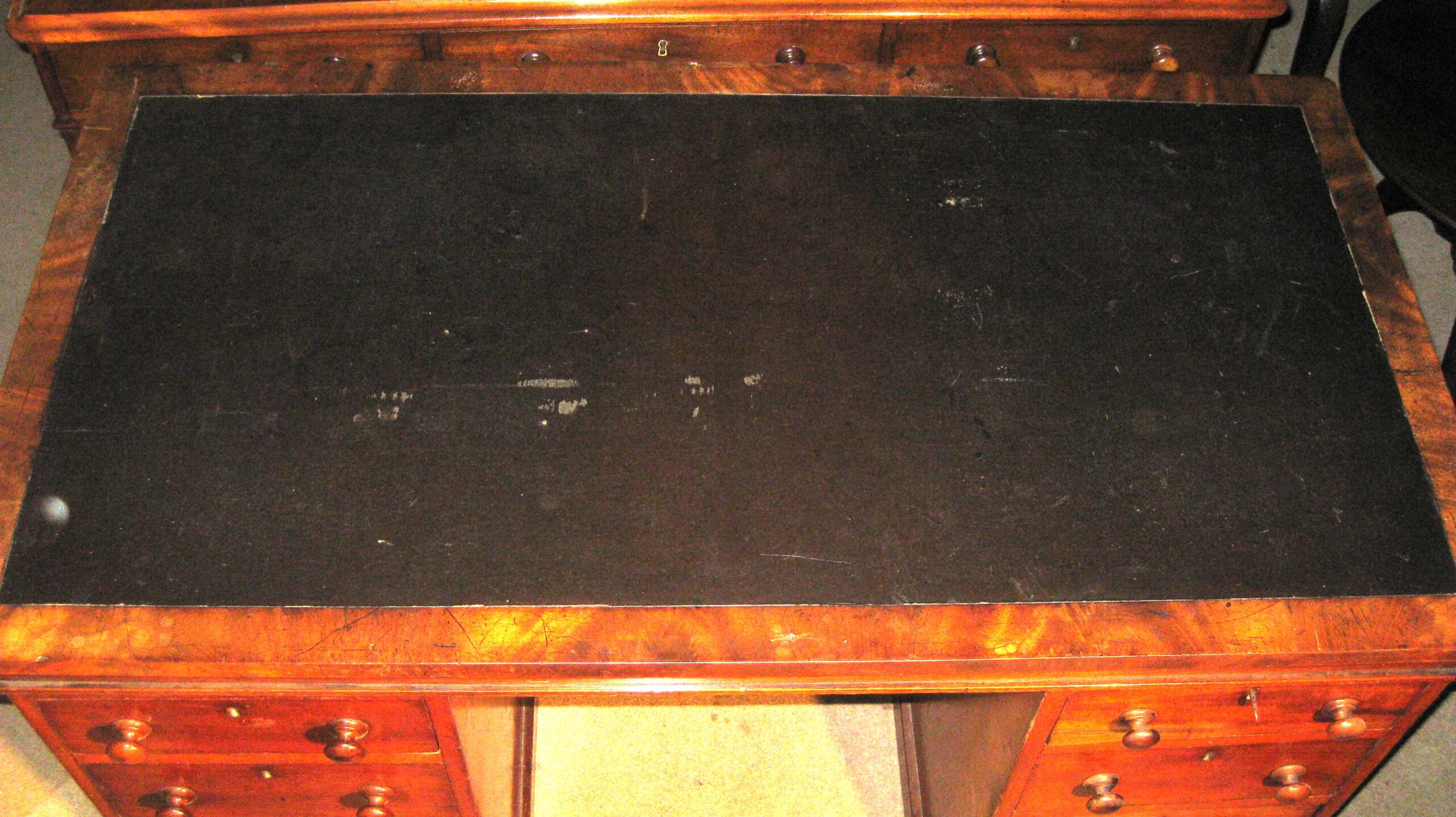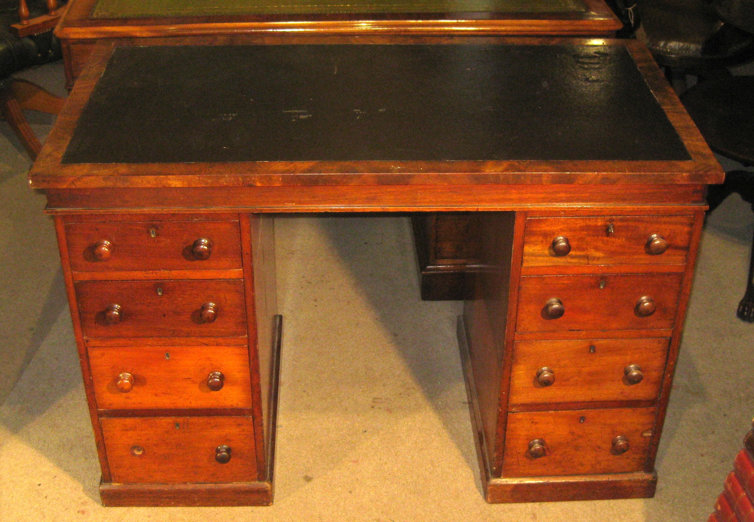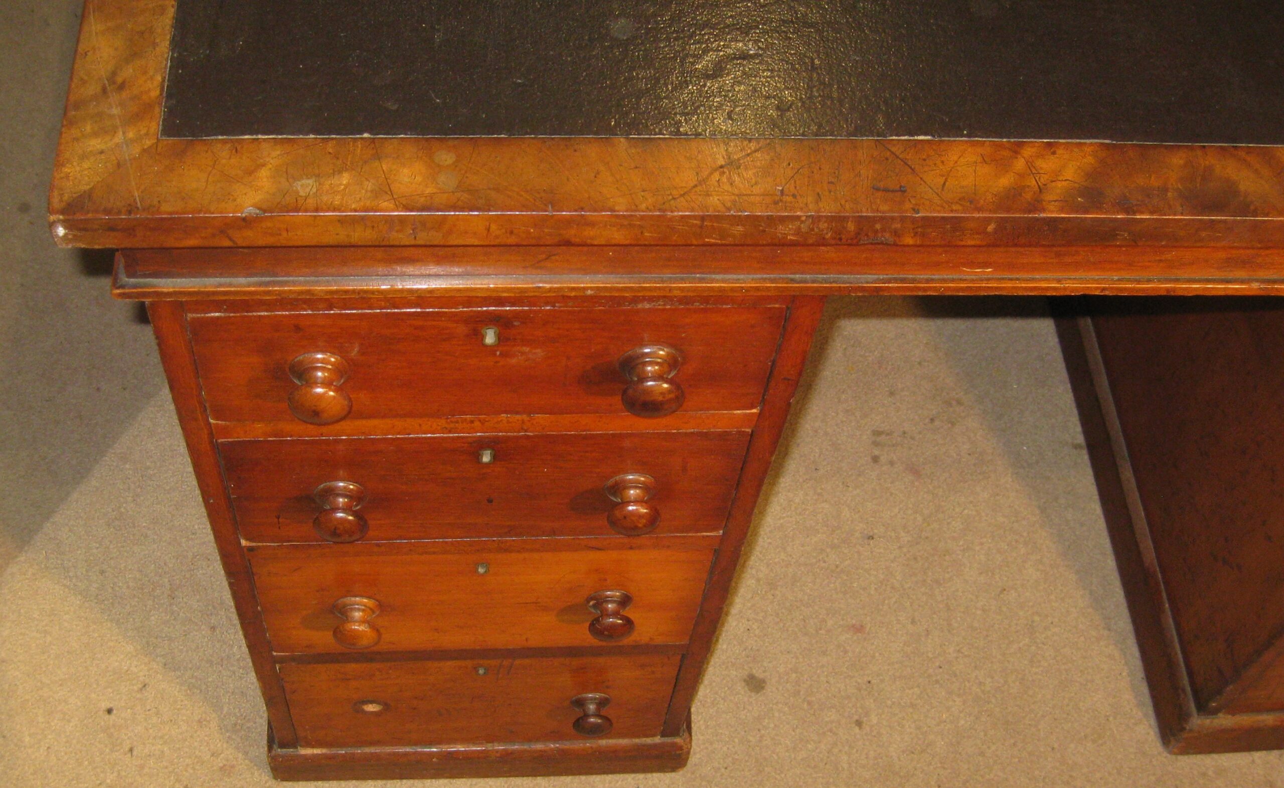 Fine quality Victorian mahogany pedestal desk. The 8 drawers of a good hand cut dovetailed construction with mahogany linings, the original turned knob handles and working locks. The top with an imitation leather insert. Shown before restoration.