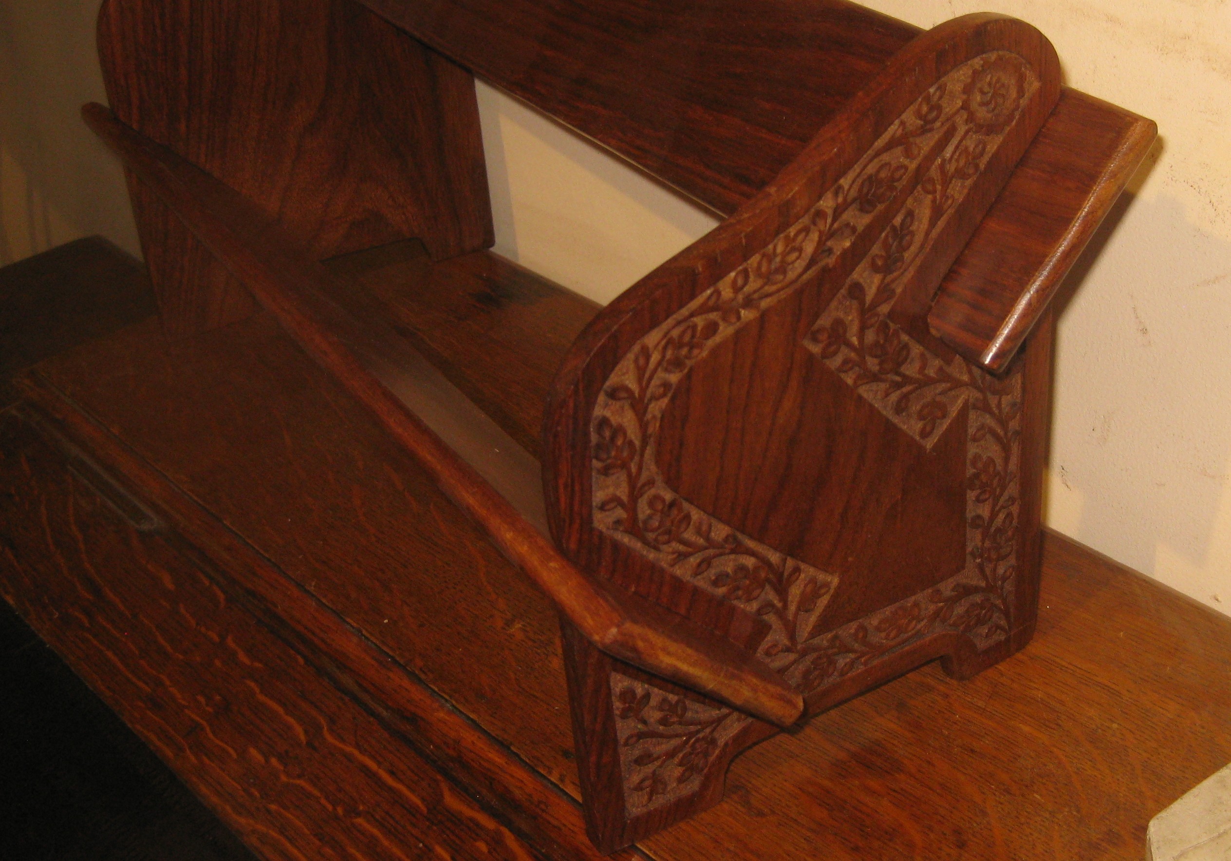 Interesting little Arts and Crafts style collapsible bookrest. With carved detail to the sides.
