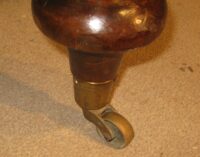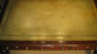 Late Victorian mahogany partners writing table. With 3 drawers to the front of a good hand cut dovetailed construction with brass knob handles and working locks. With the same format to the rear. With a lovely old full hide leather top. Standing on turned legs terminating in brass cup castors.