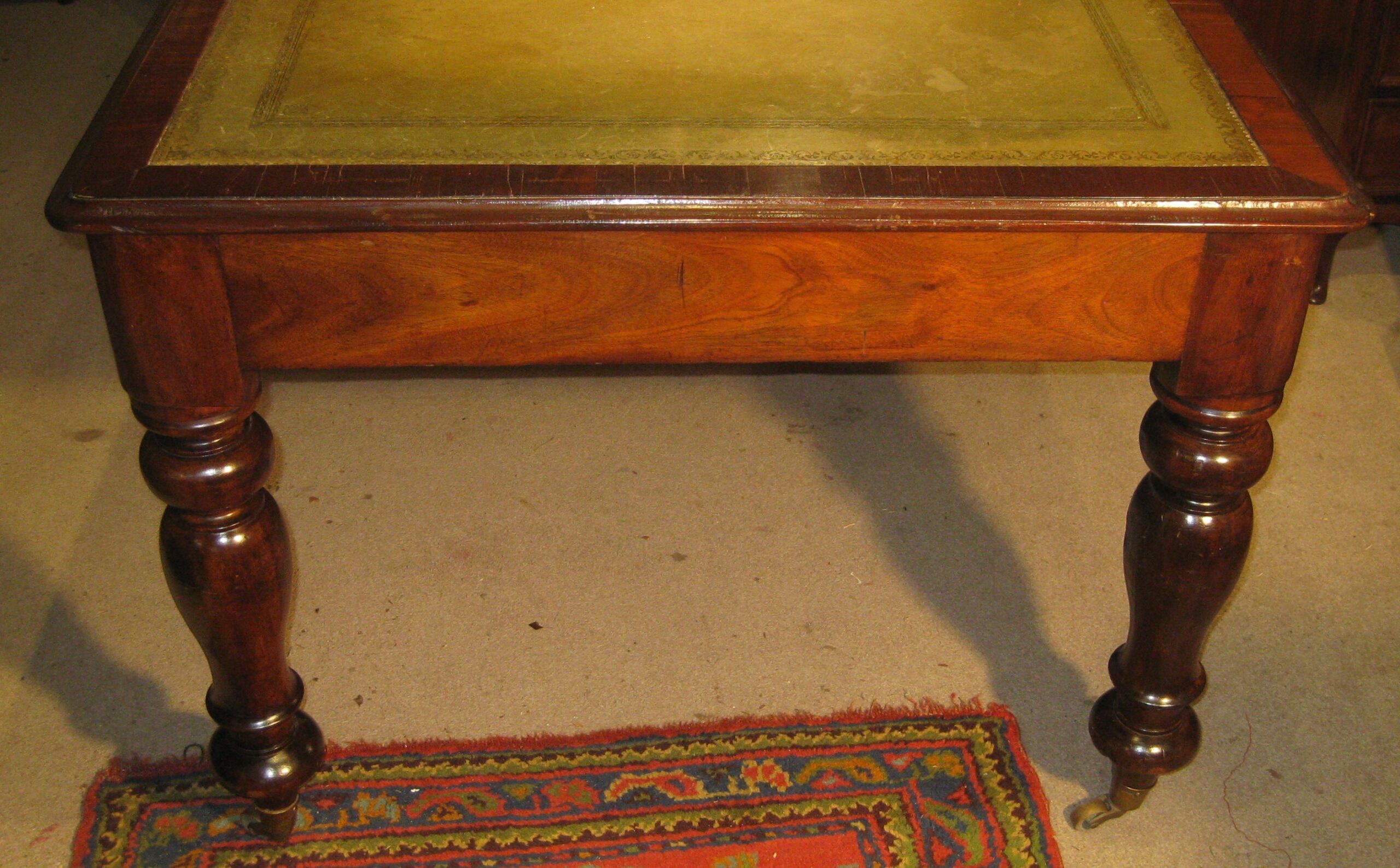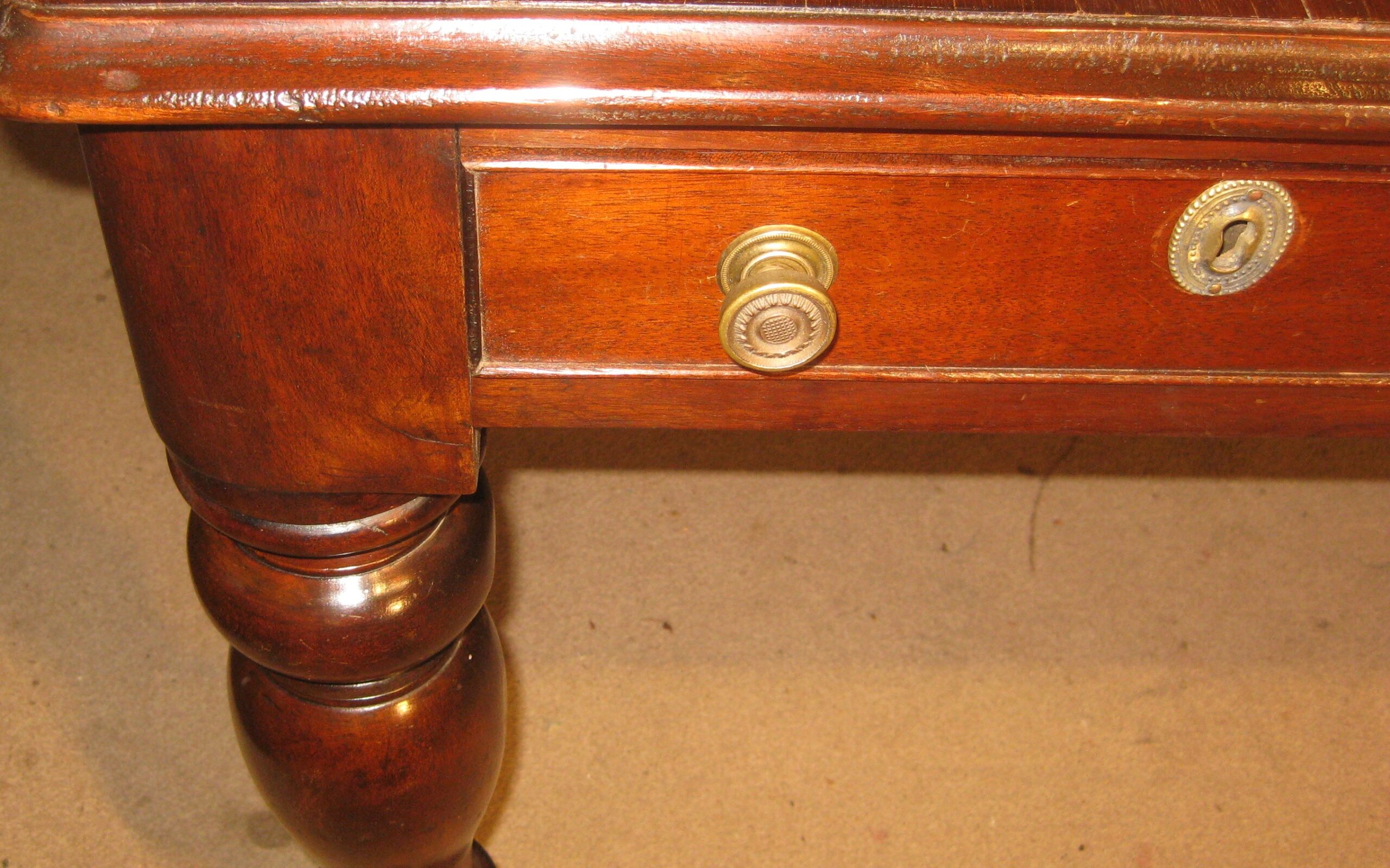 Late Victorian mahogany partners writing table. With 3 drawers to the front of a good hand cut dovetailed construction with brass knob handles and working locks. With the same format to the rear. With a lovely old full hide leather top. Standing on turned legs terminating in brass cup castors.