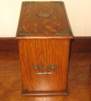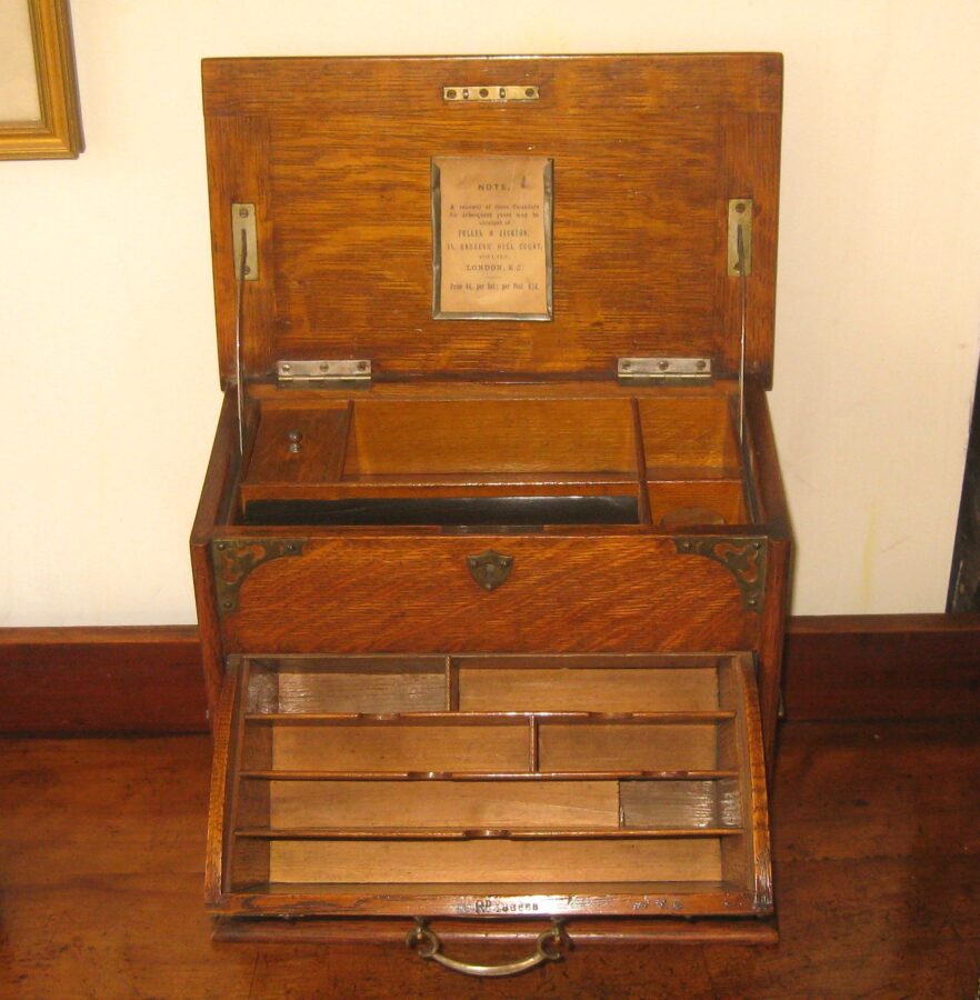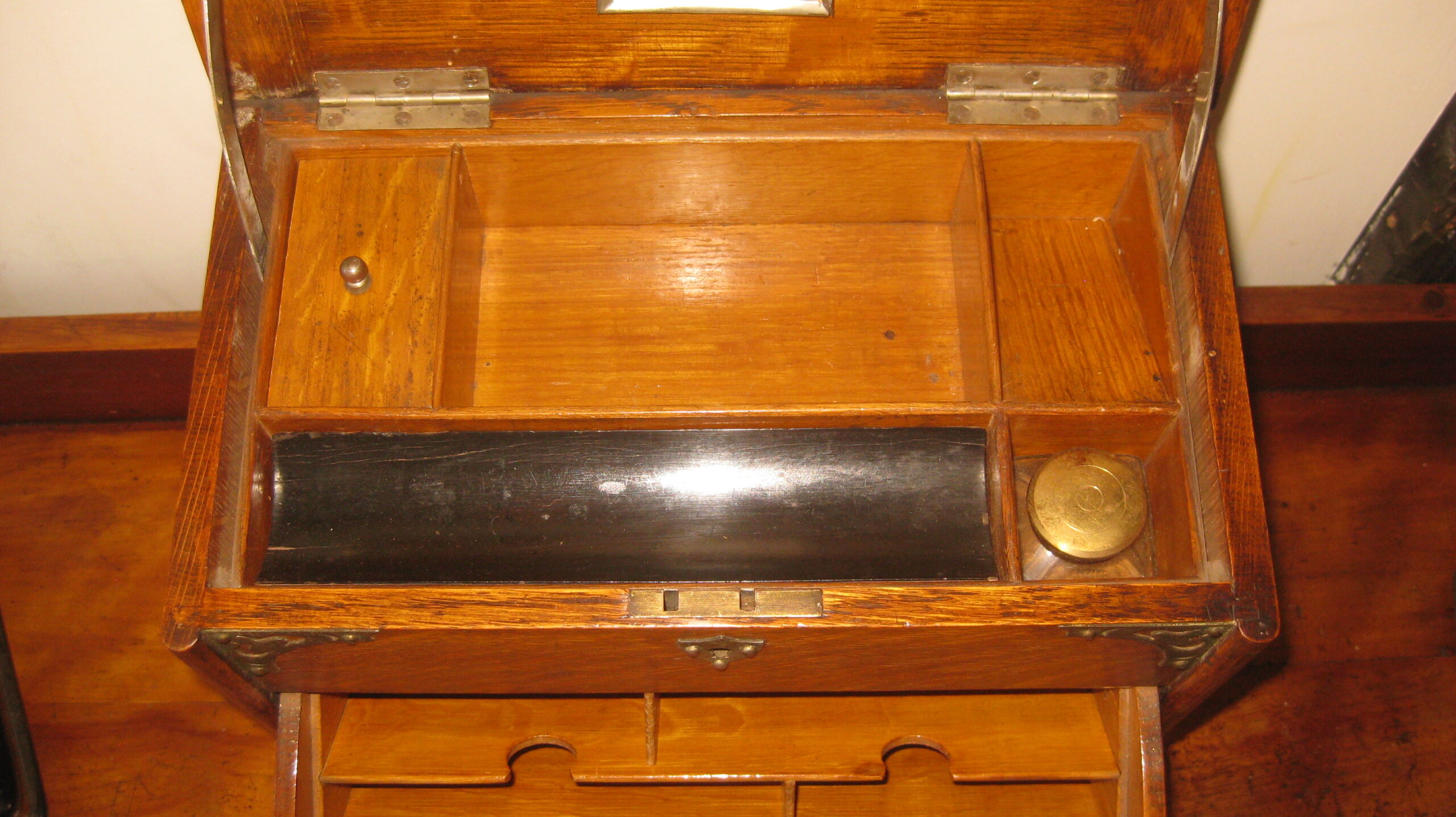 Lovely Edwardian oak stationery cabinet. The locking top opening to reveal top section with numerous compartments including pen tray, stamp slide and inkwell. At the same time the front opens to reveal compartments for stationery. With brass mounts and side lifting handles.