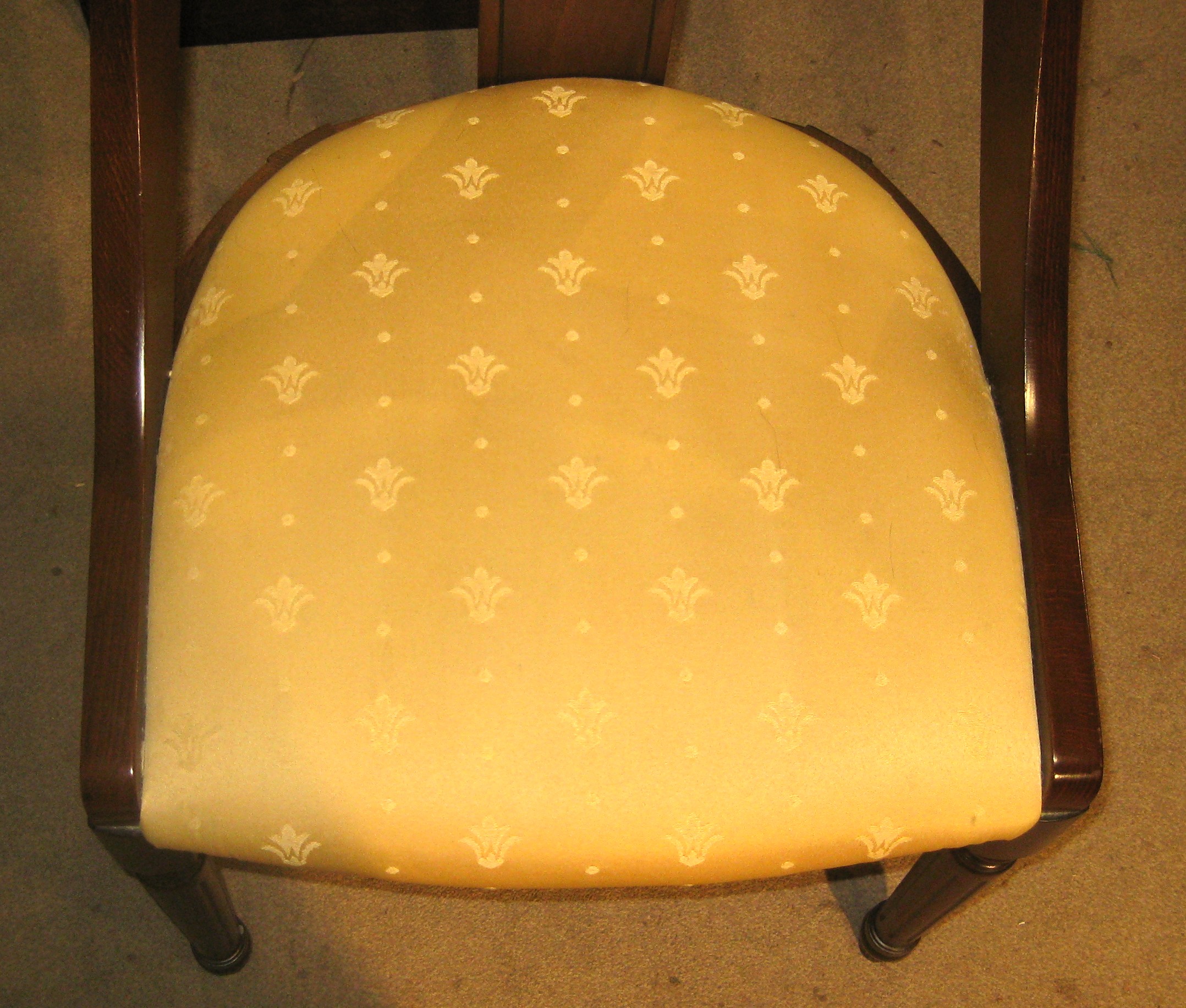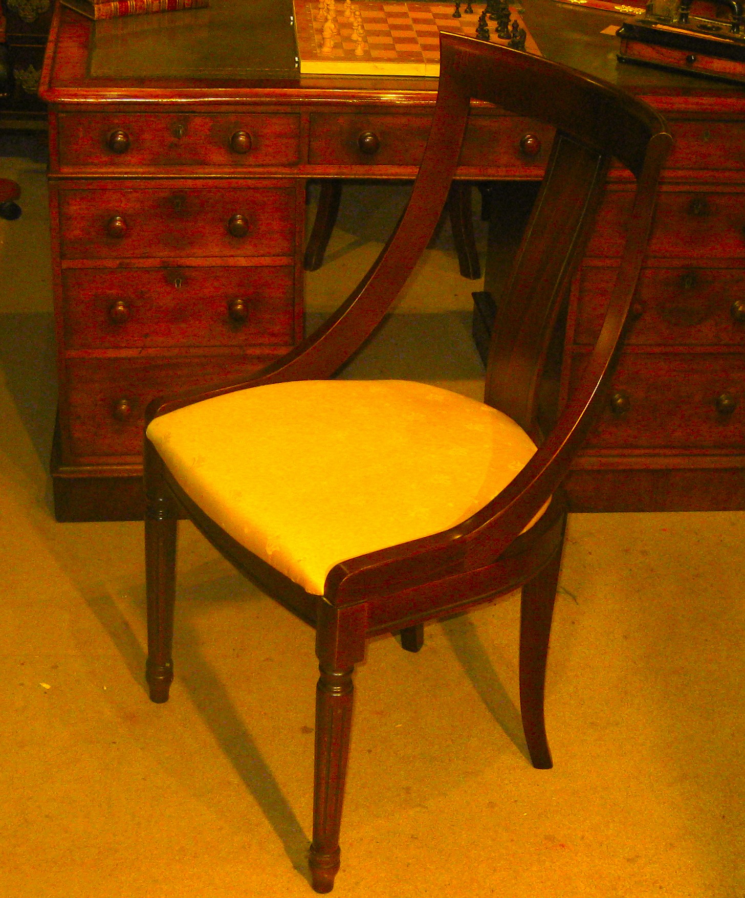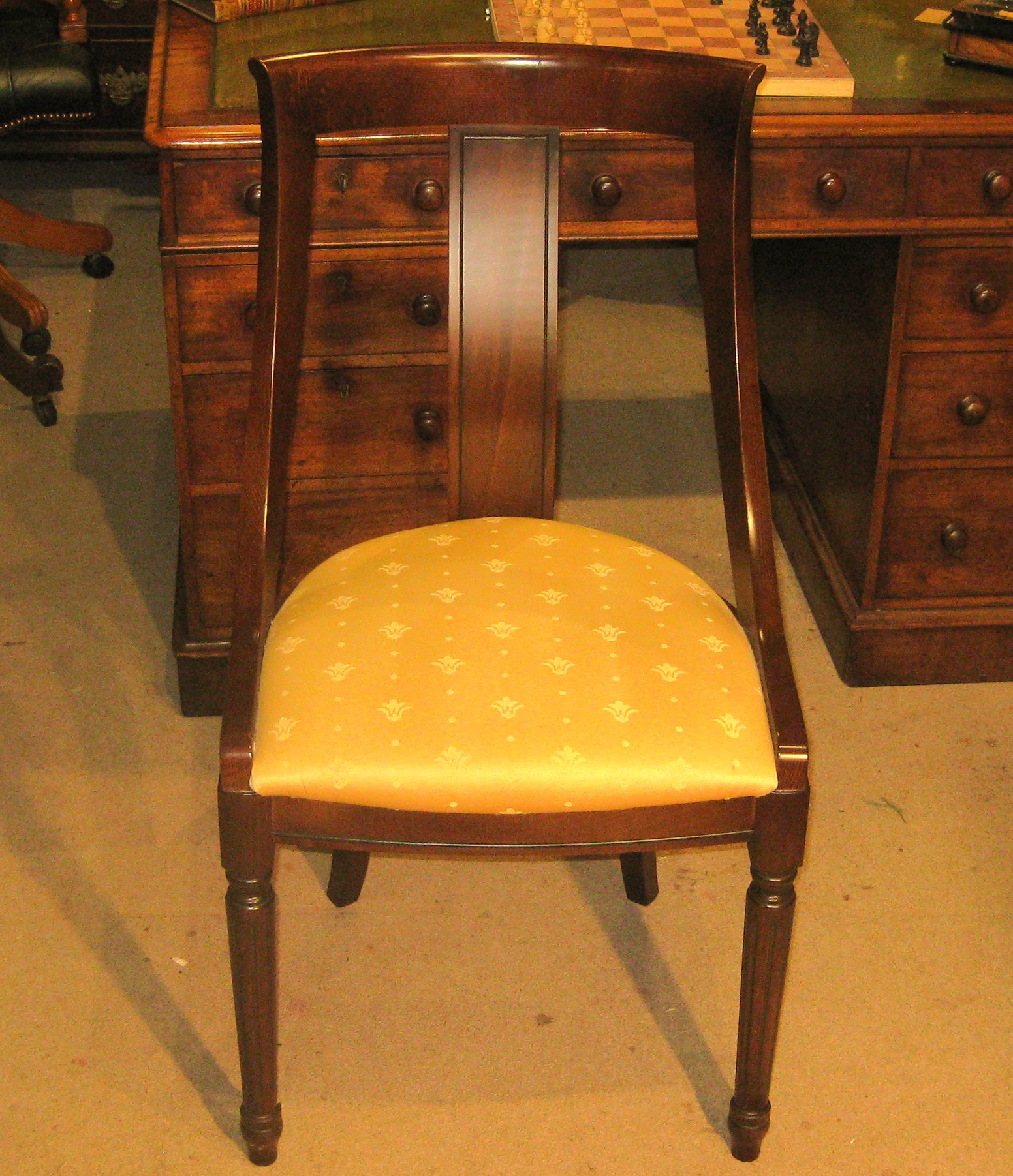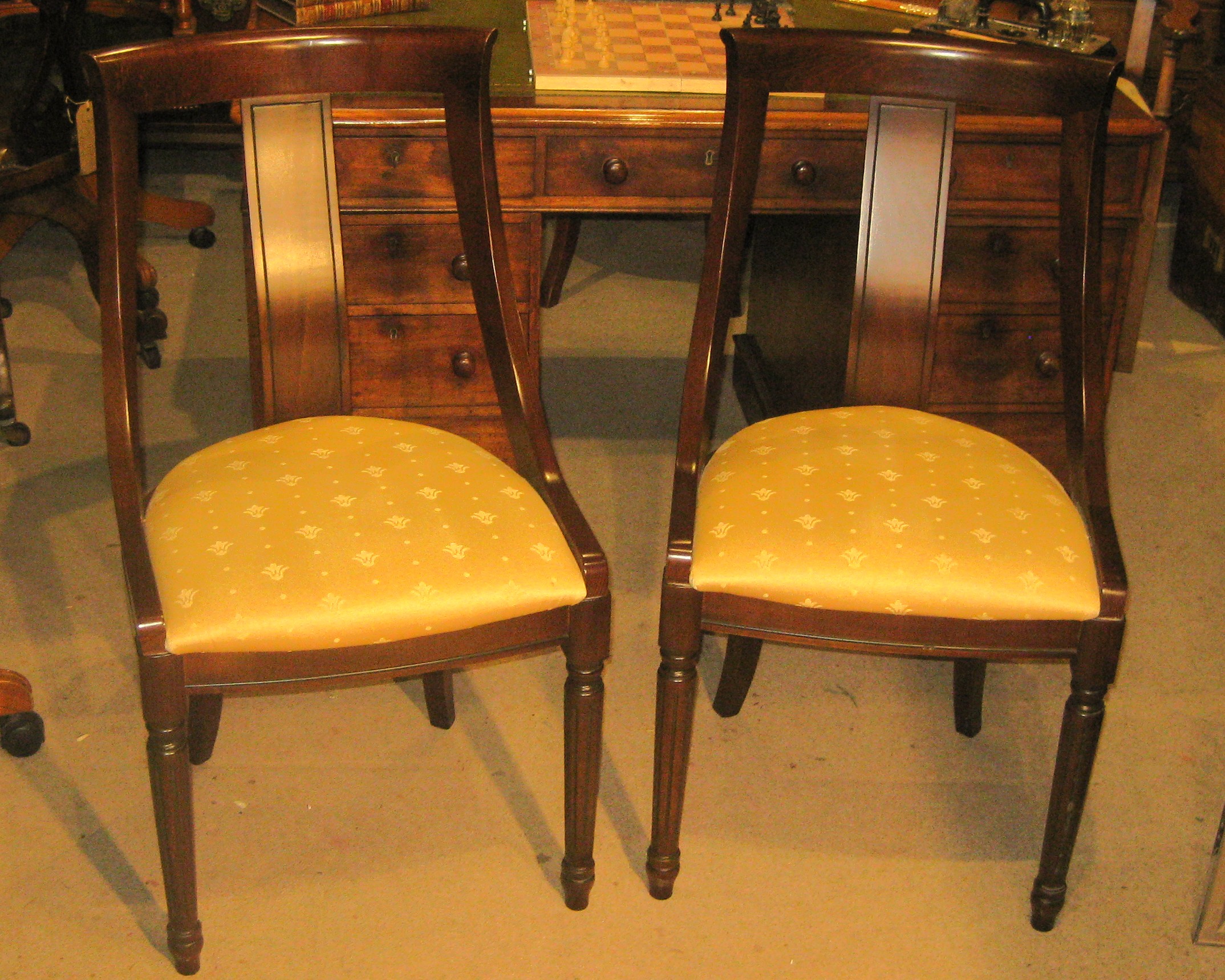 Pair of cherry wood dining /bedroom / desk chairs. With a well shaped back and upholstered seat above turned and fluted front legs.