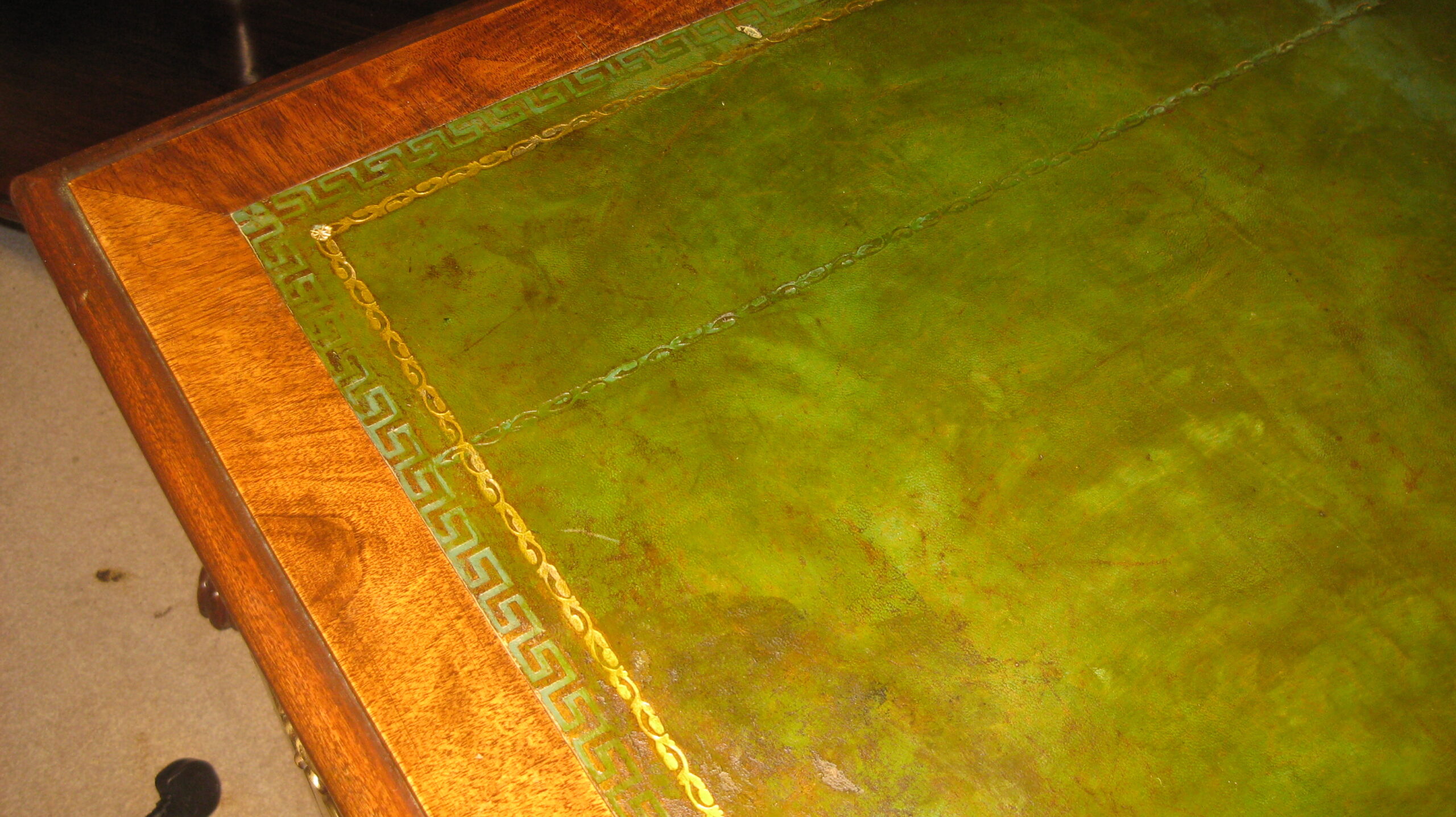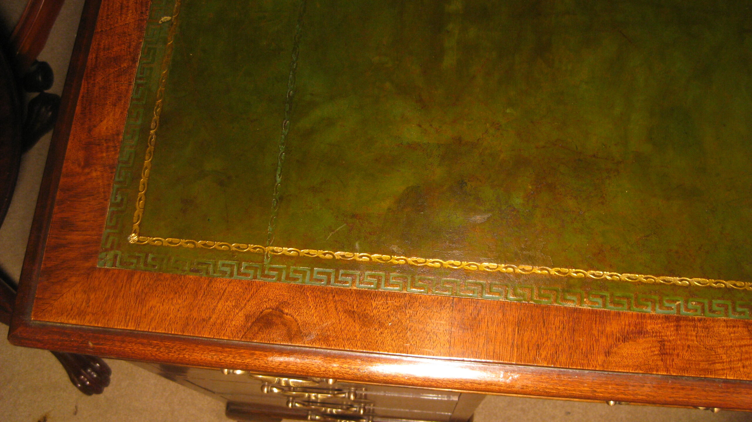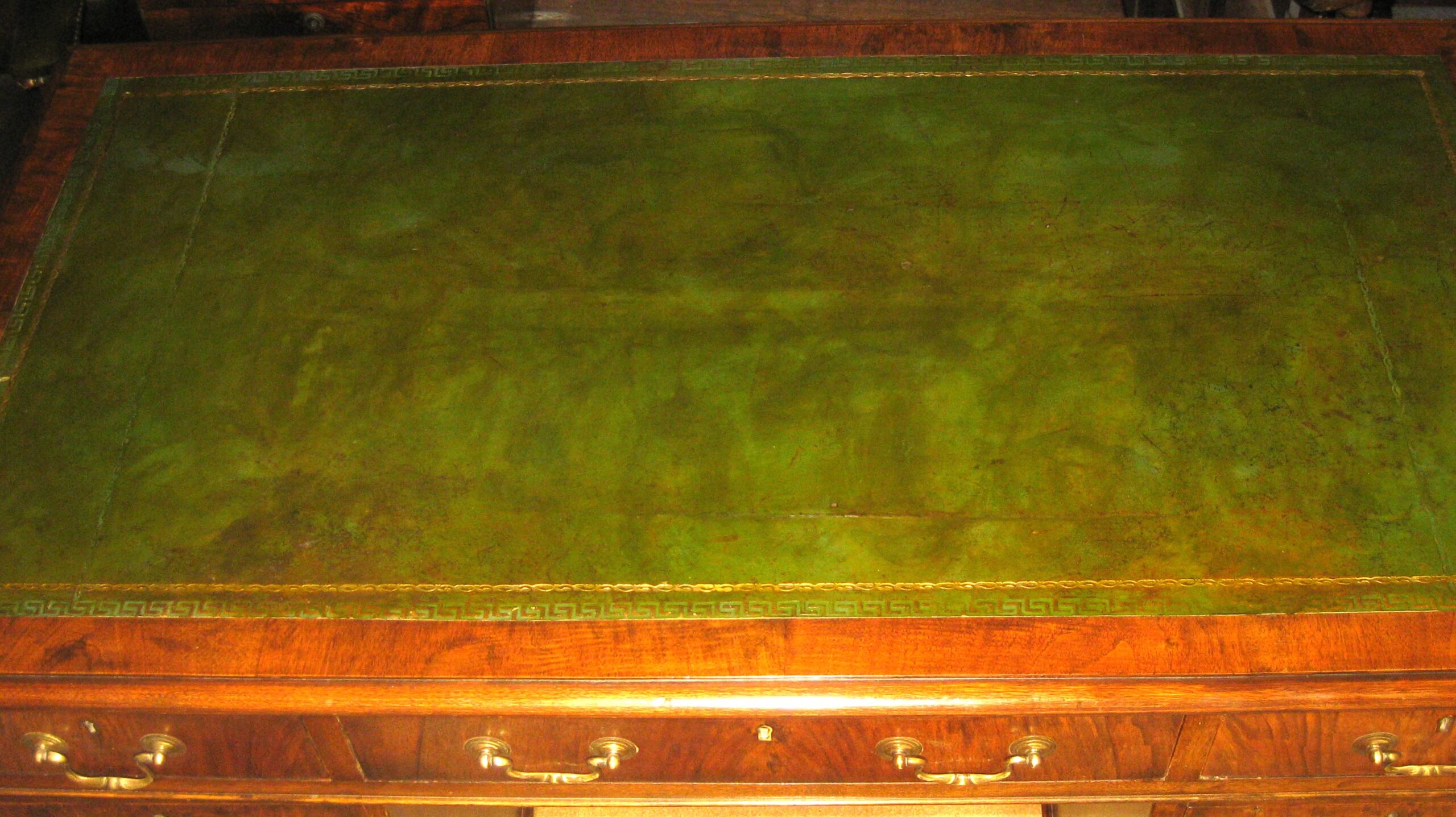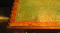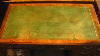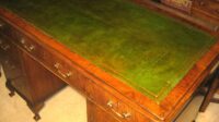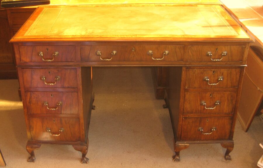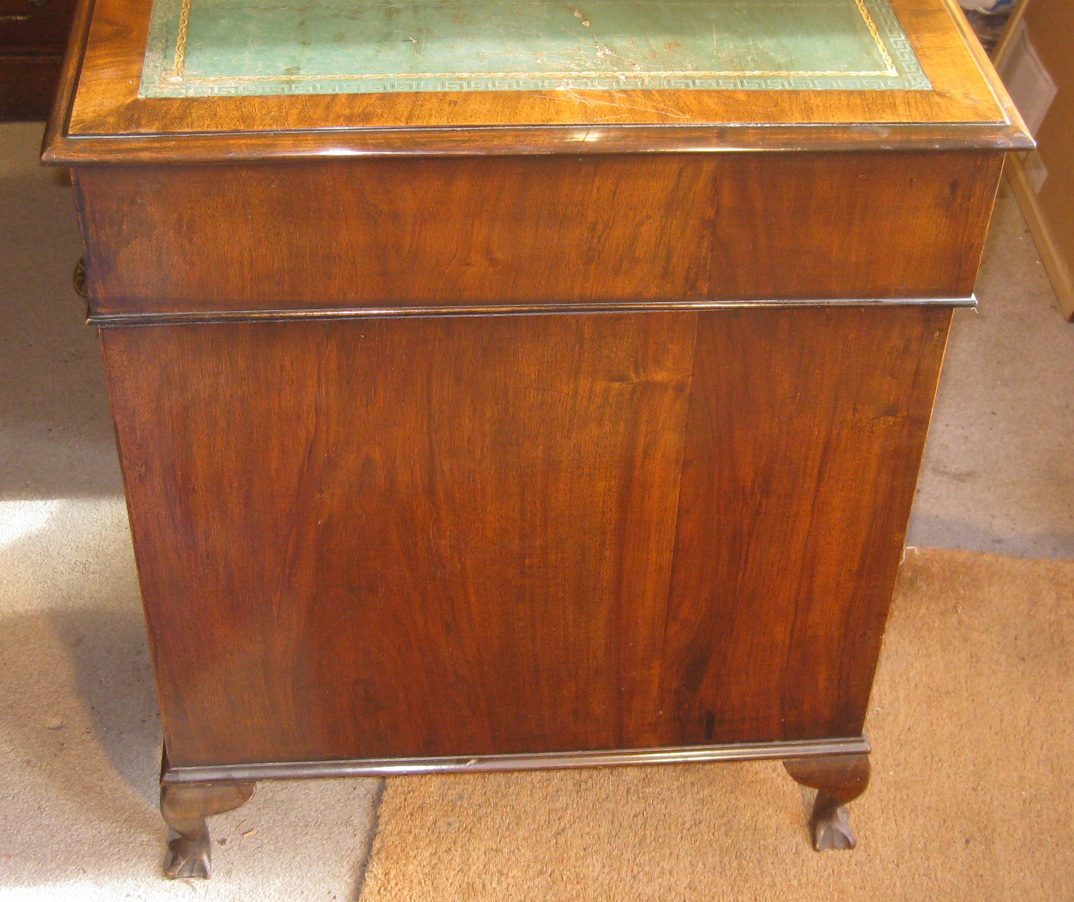 Pretty, late Victorian, walnut pedestal desk. The nine drawers of a good, hand-cut, dovetailed construction with mahogany linings, working locks and the original brass swan neck handles. The top with an original green leather top that could be changed to suit. Standing on well shaped short cabriole legs.