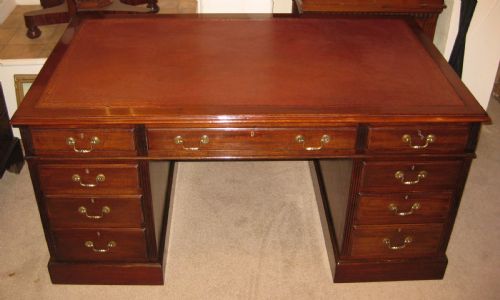 Well proportioned mahogany pedestal desk in the classic Victorian style. The nine drawers with working locks, of a good, hand-cut, dovetailed construction with solid brass swan-neck handles. The top with an old hide leather top that could be changed to suit.