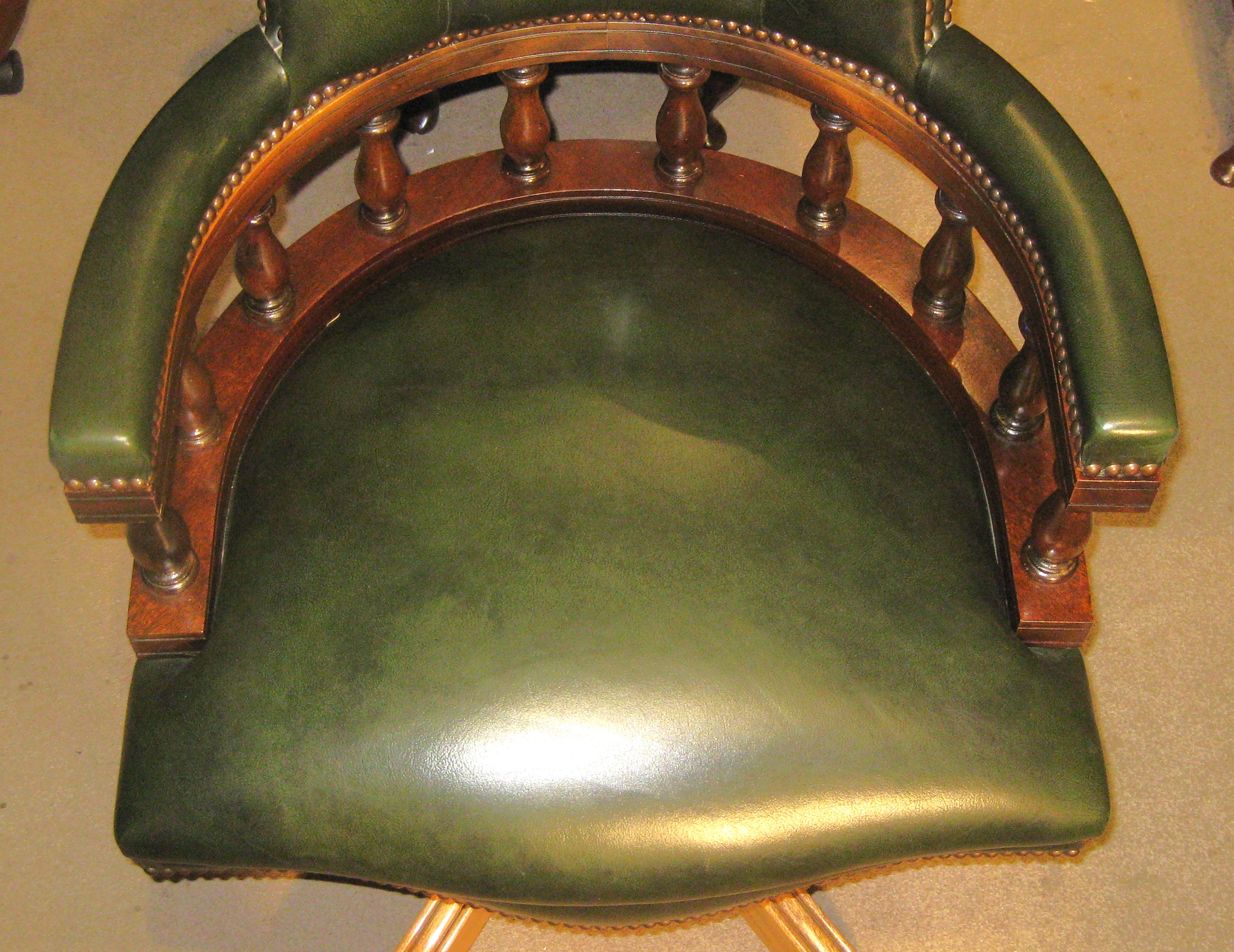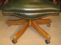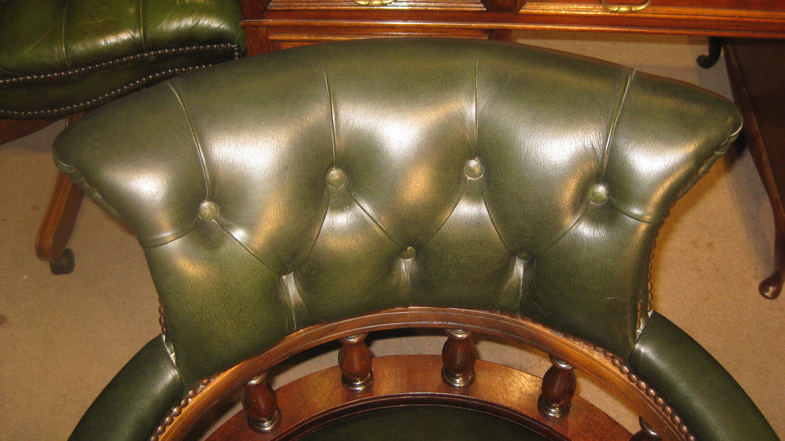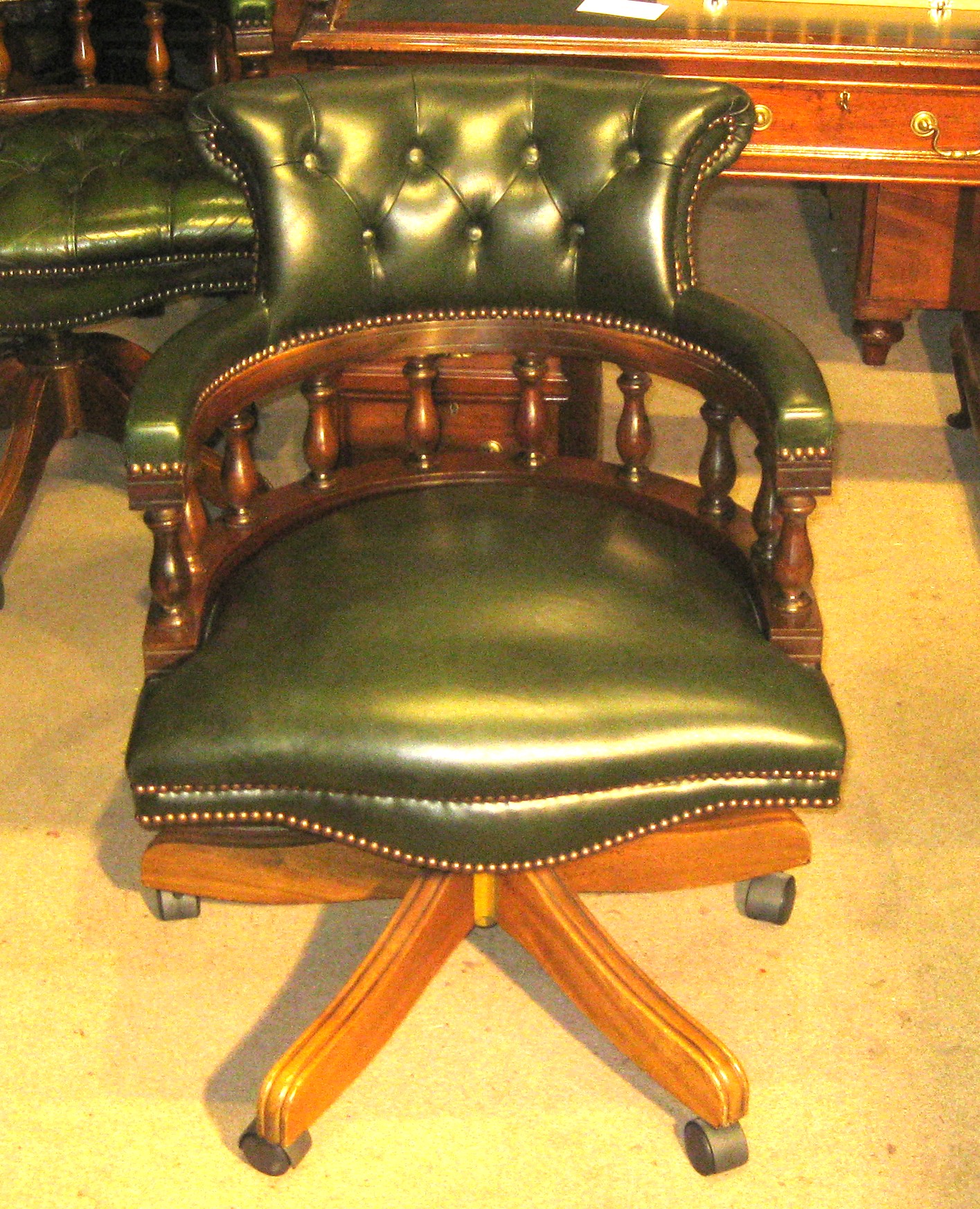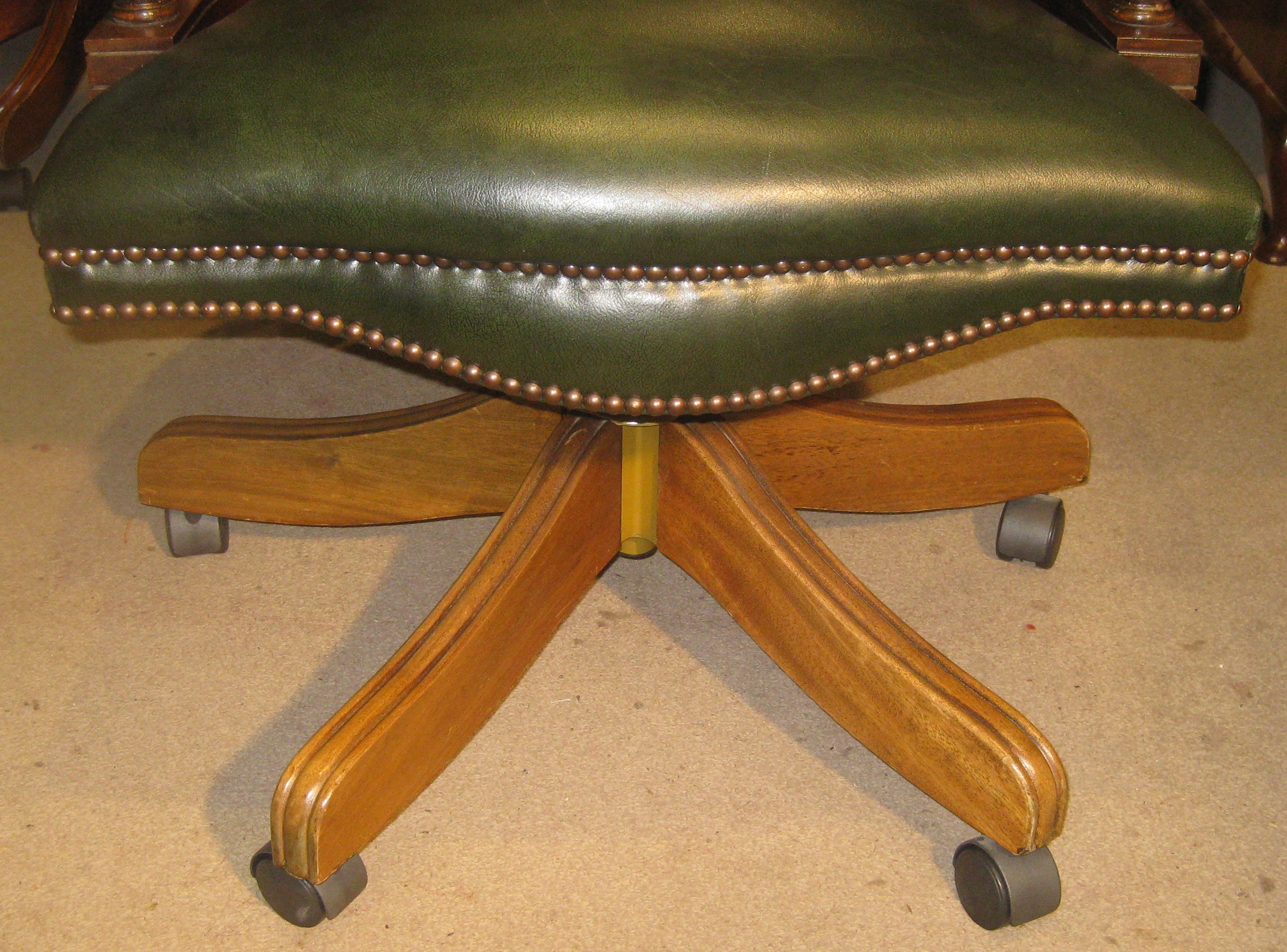 Reproduction mahogany framed Captains desk chair in green buttoned leather.