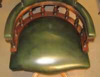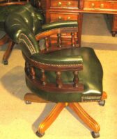 Reproduction mahogany framed Captains desk chair in green buttoned leather. The rounded back with padded arms and a turned mahogany spindle back above a fully adjustable revolving and tilting base. On free rolling castors.