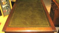 Reproduction mahogany writing table. With 3 cock beaded drawers to the front of a good dovetailed construction with brass swan neck handles and working locks. With the same image to the rear but with dummy drawers. With a lovely new green leather insert. Standing on turned square tapering legs.