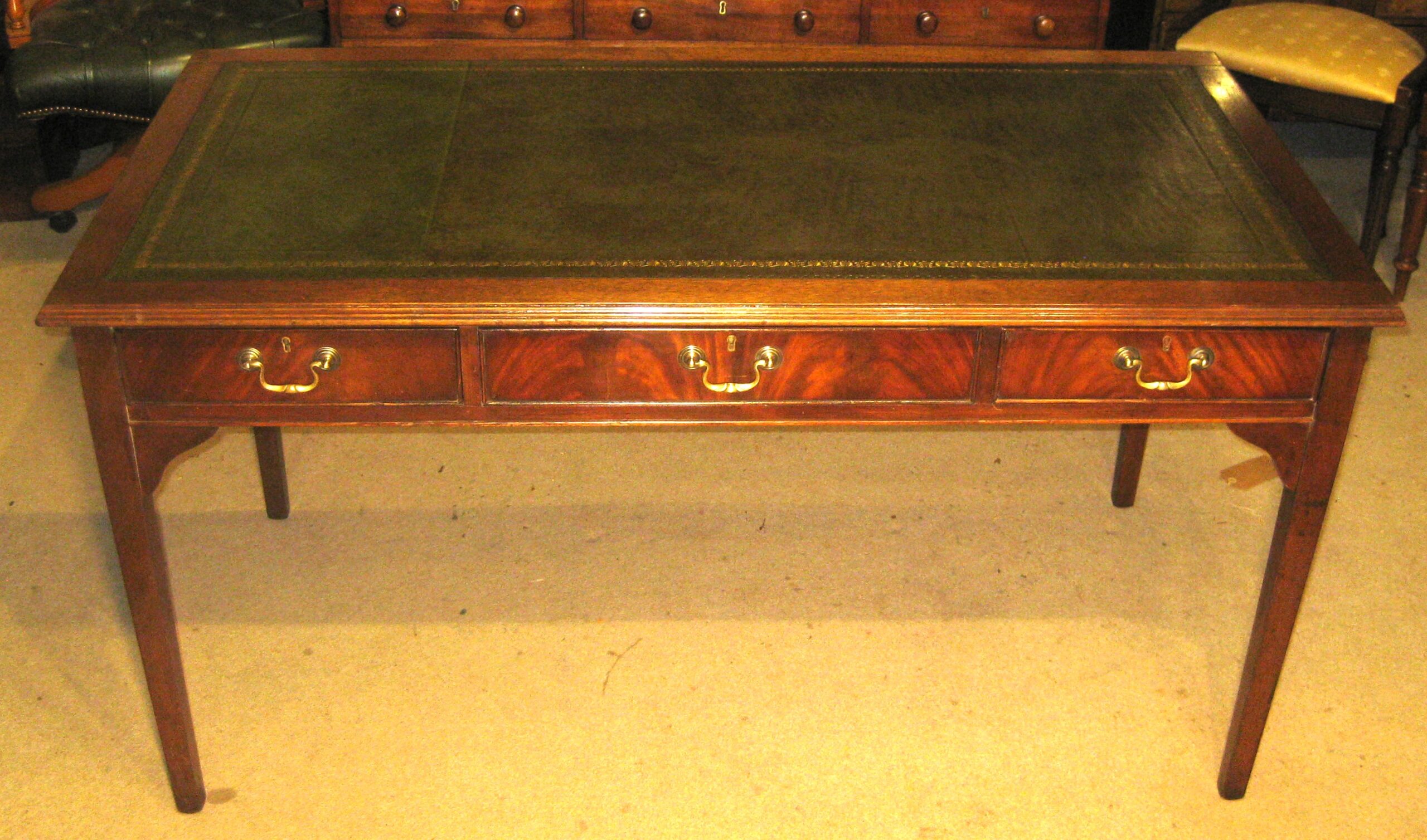 Reproduction mahogany writing table. With 3 cock beaded drawers to the front of a good dovetailed construction with brass swan neck handles and working locks. With the same image to the rear but with dummy drawers. With a lovely new green leather insert. Standing on turned square tapering legs.