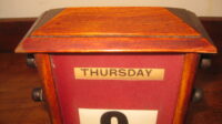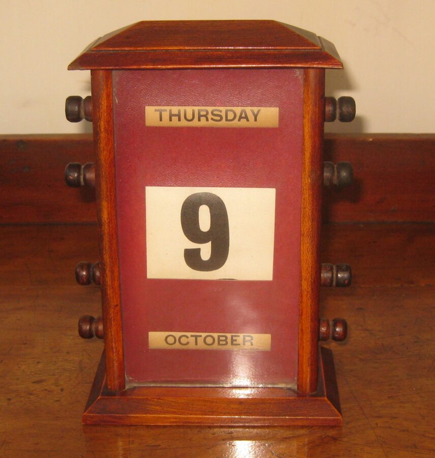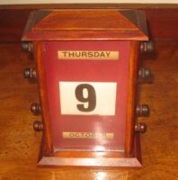 Small Edwardian mahogany desk top perpetual calendar. With all days and months in fine working order.