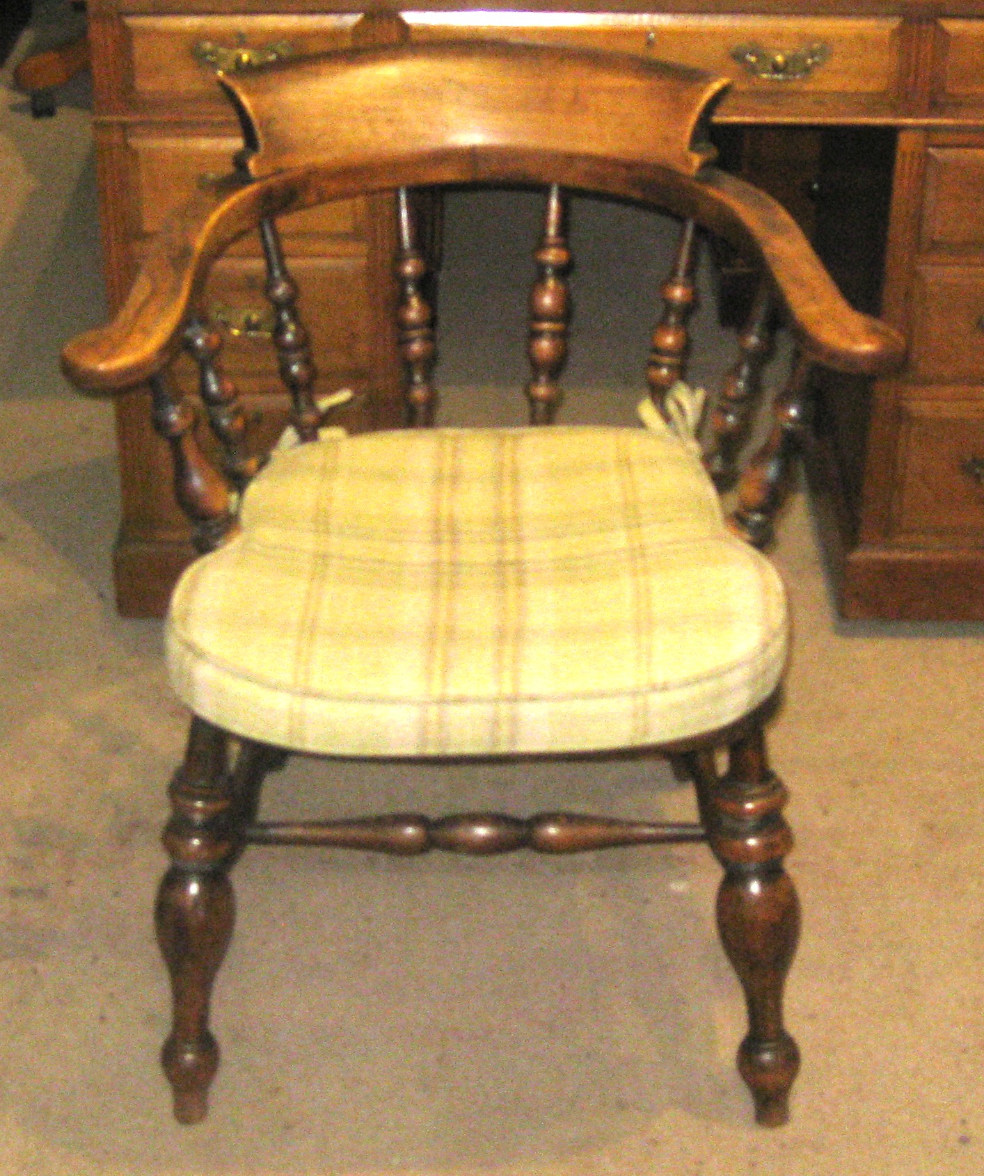 Victorian elm captains chair. With well turned spindles above a moulded seat and standing on turned legs united by a turned stretcher. In a fine and original condition and with a later upholstered loose cushion
