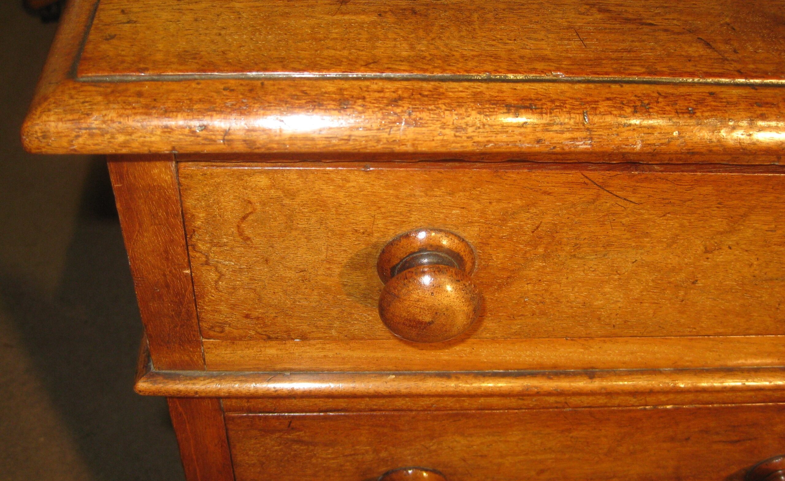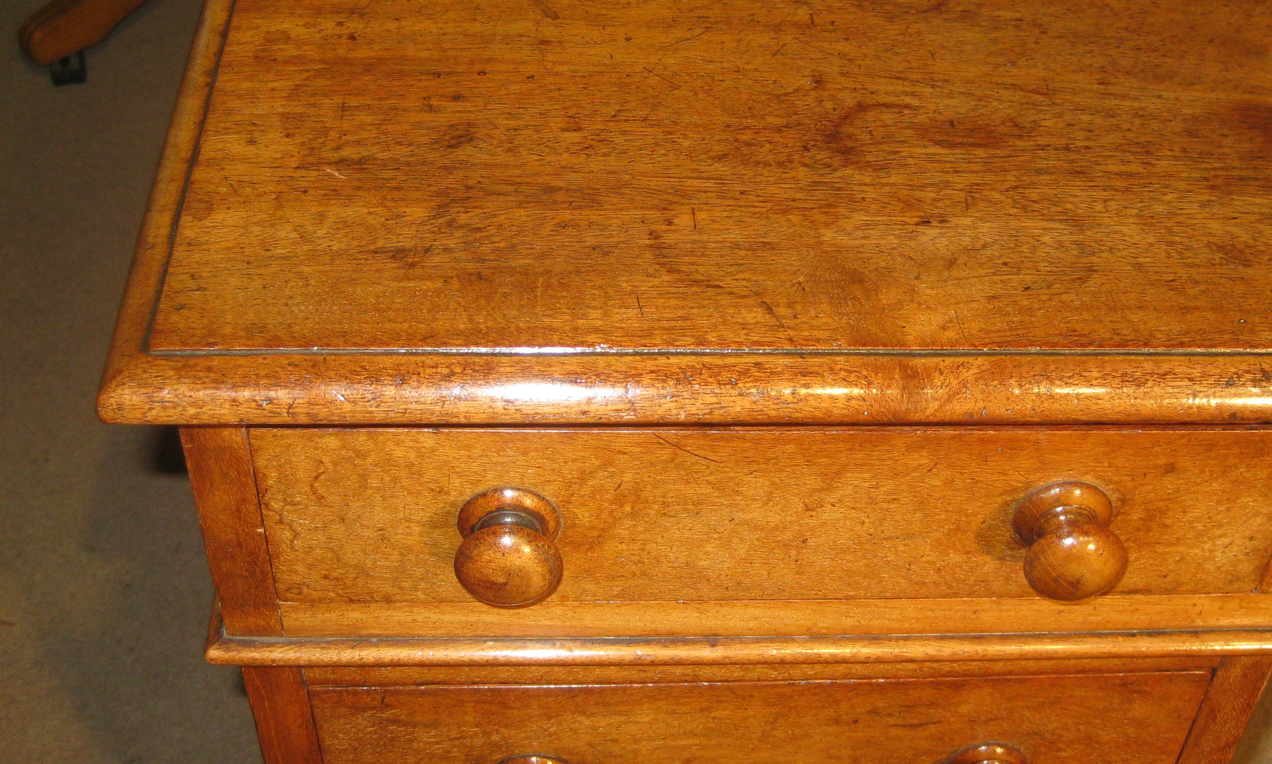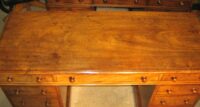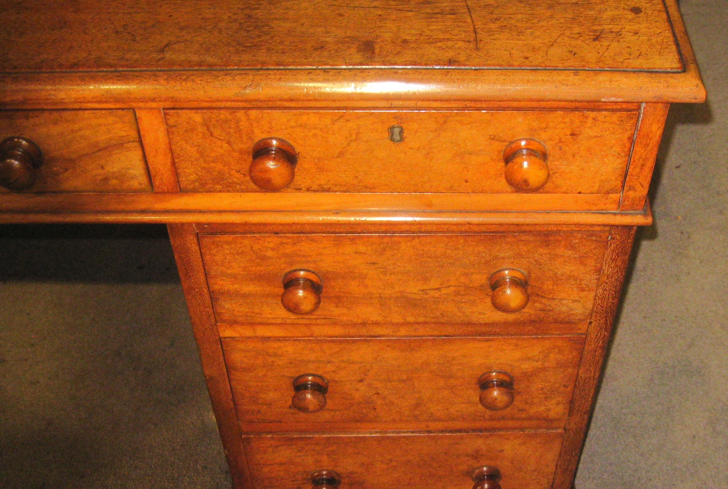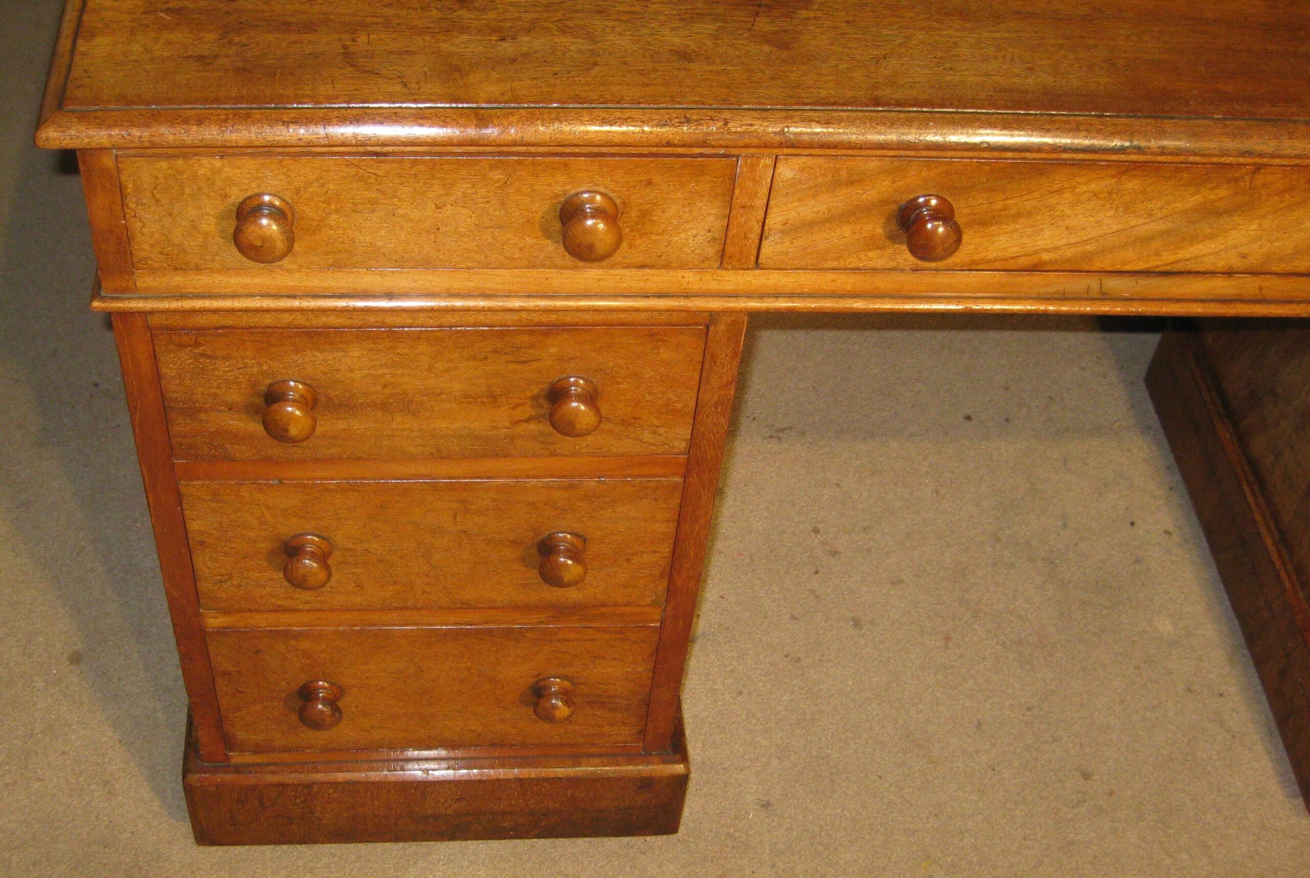 Victorian faded mahogany pedestal desk. The nine drawers of a good, hand-cut, dovetailed construction with solid linings and the original turned knob handles. The solid top made without leather but could be leathered to suit or a leathered writing pad supplied.