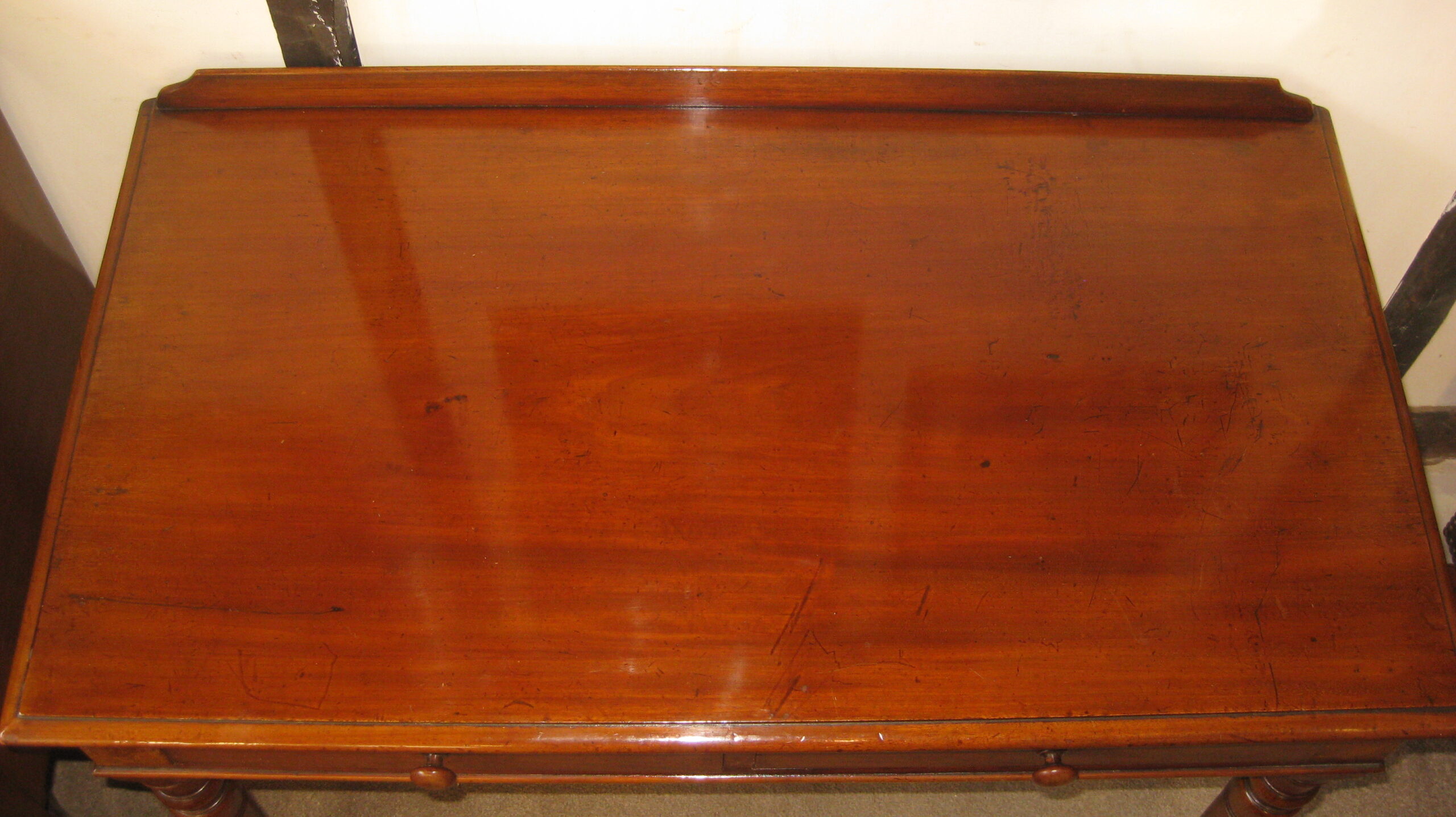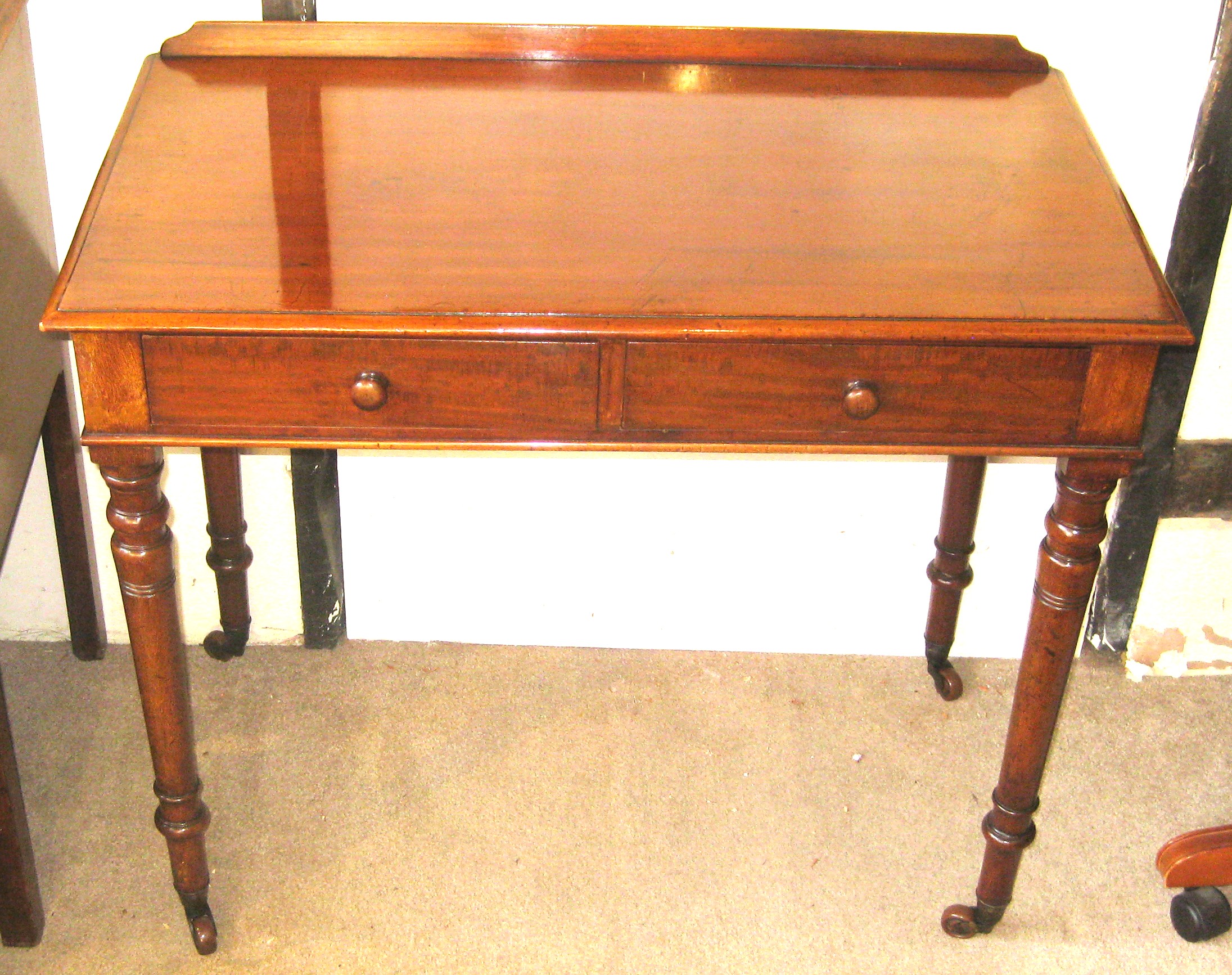 Victorian mahogany side table by Heal & Son, London. With 2 drawers of a good, hand-cut dovetailed construction with mahogany linings and turned knob handles. With a mahogany upstand and well turned legs terminating in the original brass and brown china cup castors.