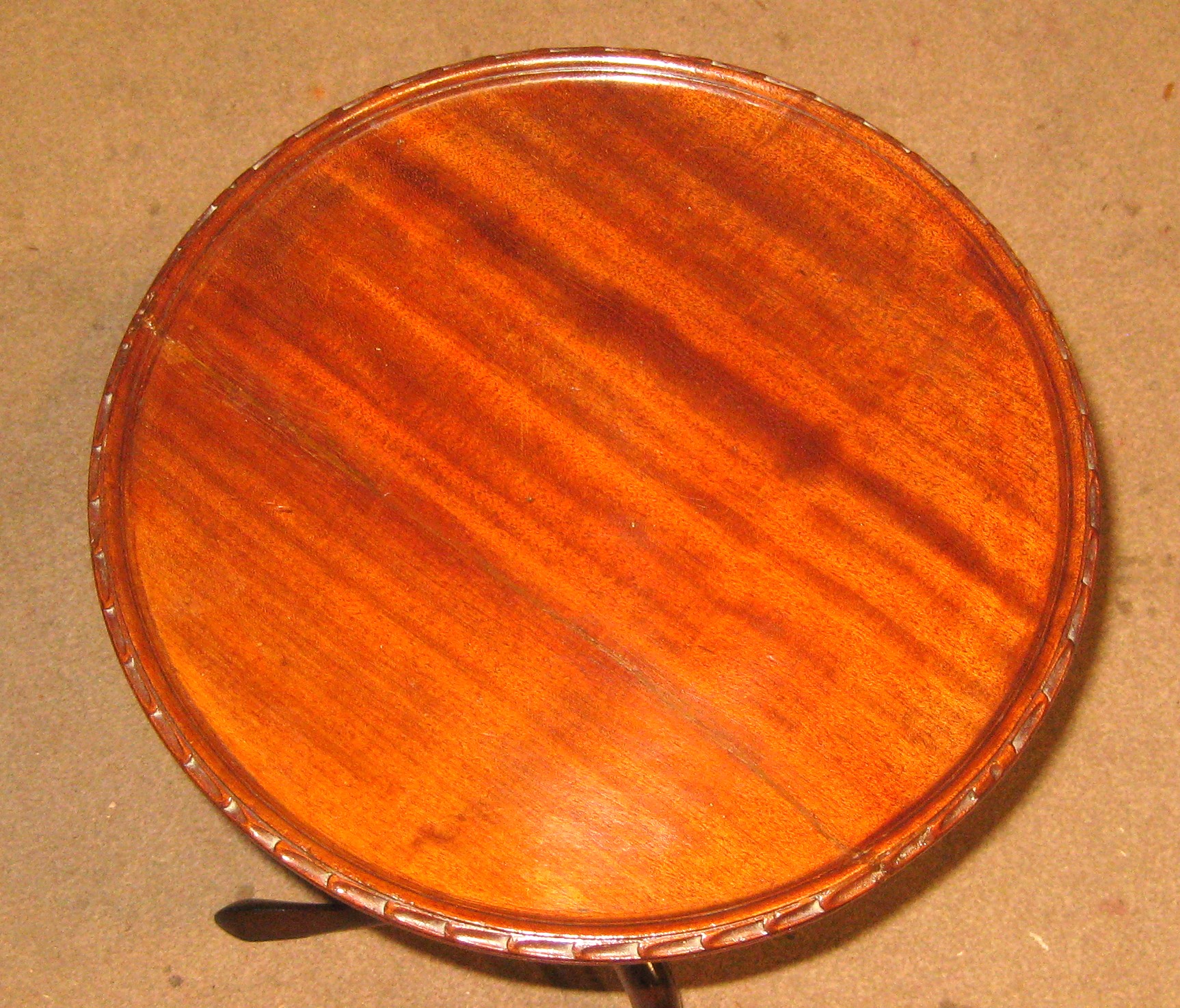 Victorian solid mahogany wine table. The top with a carved lip edge and on a well turned and carved column terminating in 3 finely shaped legs.
