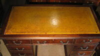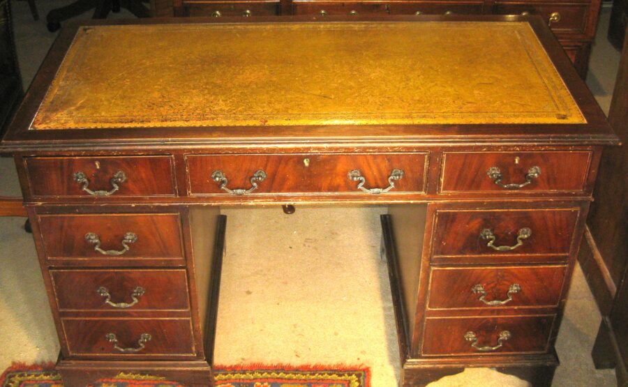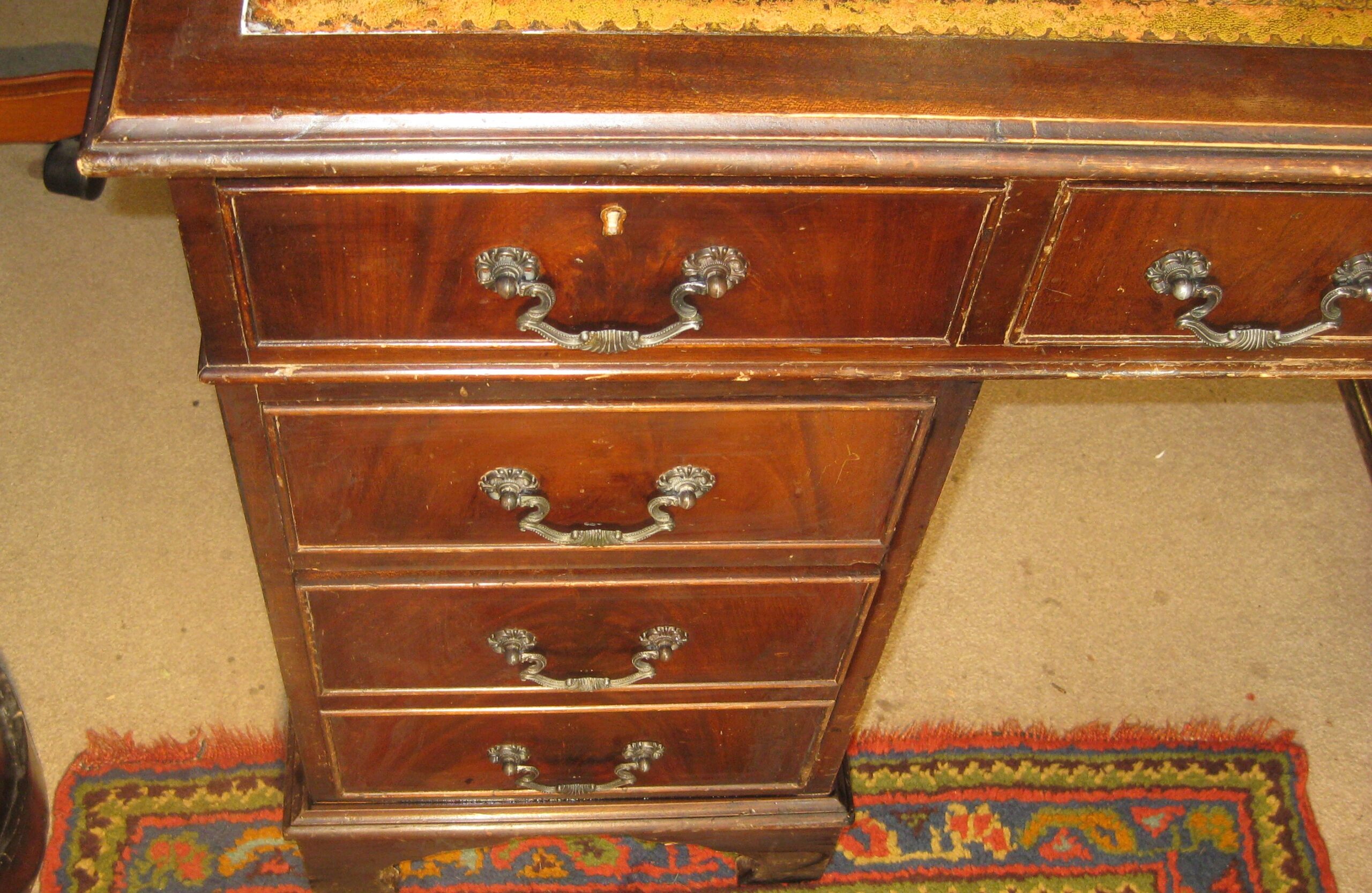 Victorian style, mahogany, reproduction pedestal desk. The 7 cock beaded drawers, including 2 double depth filing drawers, of a good dovetailed construction. With panelled effect sides and back and with ornate swan-neck handles. With a light tan leather top, standing on shaped bracket feet and with working locks.